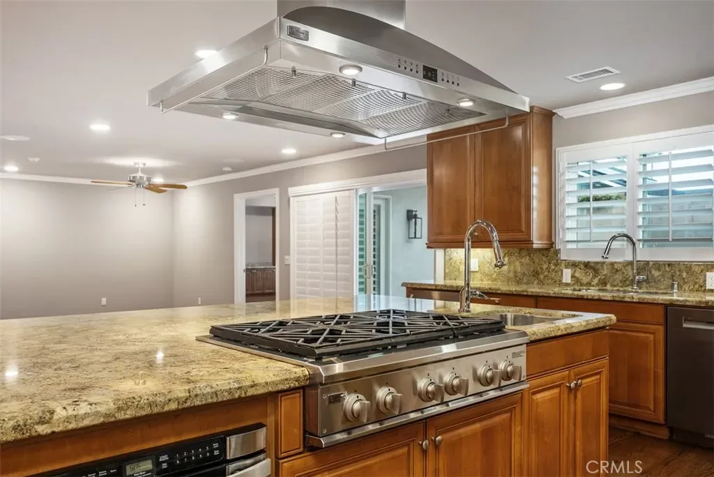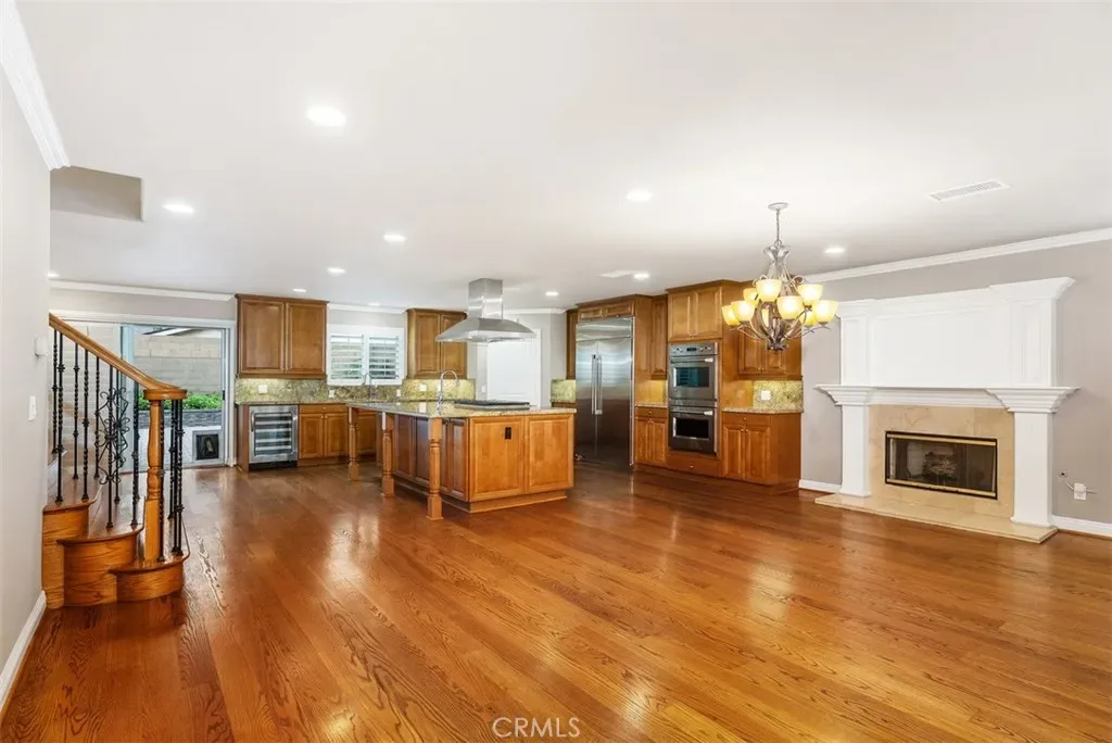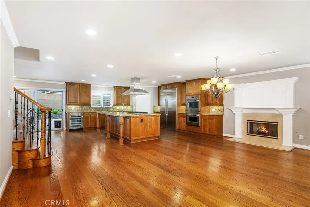 The gourmet kitchen is a true centerpiece, showcasing premium stainless steel Monogram appliances, a Bosch dishwasher, and an expansive island with seating that opens seamlessly to the dining and living areas—ideal for entertaining.