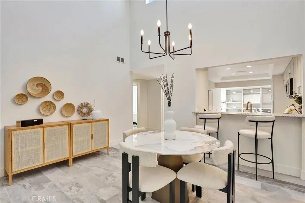 The reconfigured entry features luxury Italian tile flooring, an added hall closet, and an open, airy layout made possible by relocating the new high efficiency HVAC system to the newly insulated attic. The kitchen offers updated white shaker cabinetry and new stainless steel appliances and flows seamlessly into the dining and living areas. The living room showcases vaulted ceilings, skylights, a modern light fixture, and high-end window upgrades that bring in light and coastal breezes. French doors from both the living room and dining area open to the patio, creating effortless indoor-outdoor living.