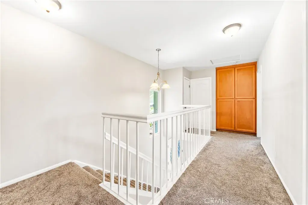 Upstairs, a generous landing leads to the serene primary suite, featuring vaulted open-beam ceilings, ample space for a king-sized bed, and a private vanity area with dual sinks, a sit-down makeup counter, and a huge walk-in closet. The en-suite bath includes a spotless walk-in shower with built-in shelving and a privacy door. Two additional bedrooms offer fresh paint, new carpet, and plenty of light. The upstairs hall bath also features dual sinks and a full tub.