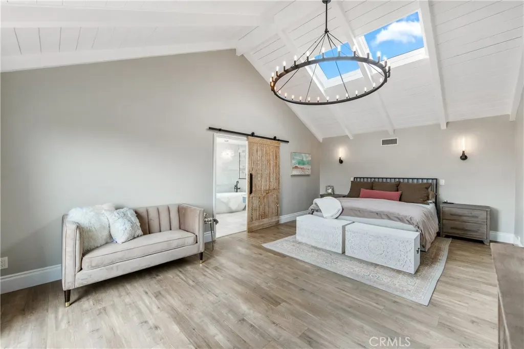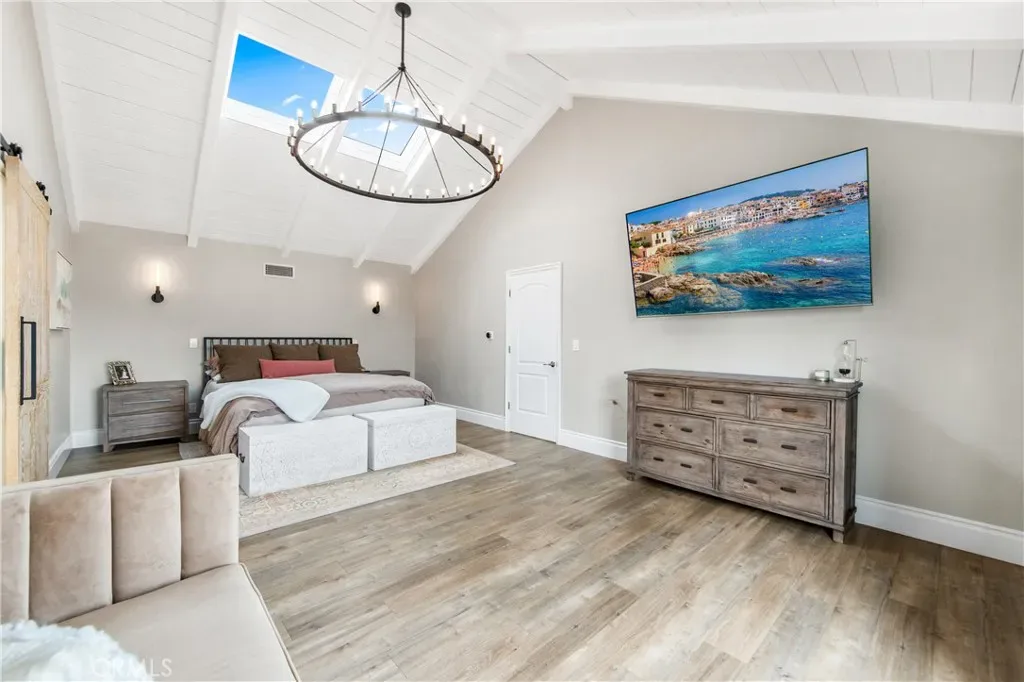 A standout feature is the rare dual-suite layout. The main level includes a spacious private suite ideal for guests or extended family, while upstairs a dramatic primary retreat offers cathedral ceilings, skylights, a Juliet balcony, soaking tub, marble shower, dual vanities, and a custom walk-in closet — perfectly suited for multigenerational living or long-term flexibility.