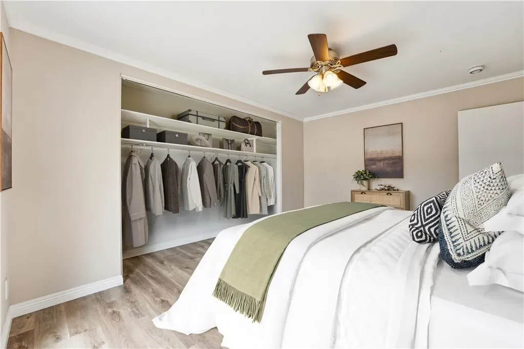 Inside, the home offers an open, light-filled layout with ceiling fans throughout and seamless indoor-outdoor flow. Both bedrooms feature sliding glass doors that open directly to the expansive backyard — creating a rare connection to outdoor living you don’t often find at this price point.