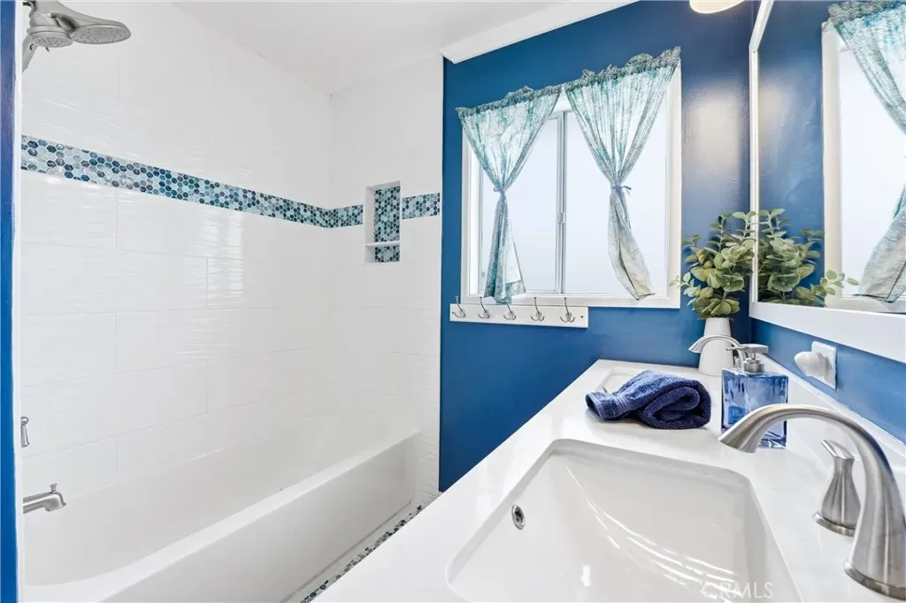 The remodeled bathroom is thoughtfully designed with a dual-sink vanity, quartz countertops, and a shower-in-tub combination, blending style and functionality. An individual laundry room adds convenience, while the attached two-car garage provides ample storage and parking.