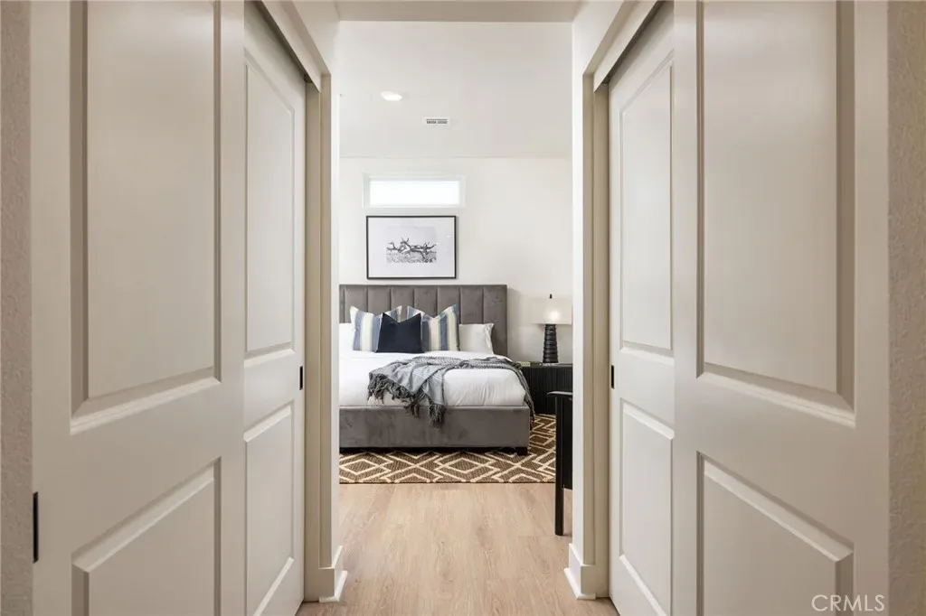 Step inside and nearly ten foot ceilings draw the eye out through large windows toward something unexpected for a Downtown address: unobstructed views of Saddleback Mountain to the east and the roofline and treetops of Fashion Island to the south. Bertazzoni appliances, quartz countertops, counter to ceiling backsplash, and elegantly lit vanity sconces are the kind of finishes that hold up to daily life rather than just showroom scrutiny. Both bedrooms are ensuite, each with a frameless glass shower, soaking tub, and a generous walk in closet.