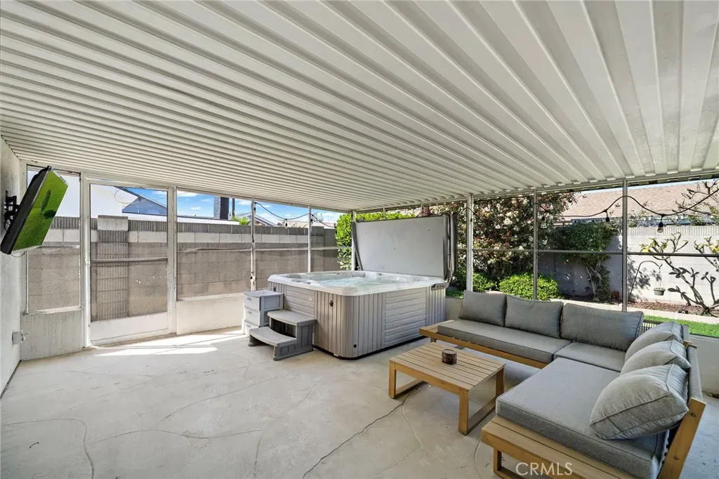 Welcome to 8181 Holland Drive, a beautifully updated 4-bedroom, 2-bath home nestled in the desirable Dutch Haven neighborhood of Huntington Beach. This inviting residence features a stunning gourmet kitchen with white shaker cabinets, soft-close doors and drawers, sleek quartz countertops, a full designer glass tile backsplash, stainless steel appliances, and recessed lighting. The home offers an open great-room layout enhanced by gorgeous, durable wood-look tile flooring that flows seamlessly through the living areas, kitchen, hallway, and bathrooms. Additional upgrades include smooth ceilings, dual-pane windows and sliding doors throughout. The spacious living room is highlighted by recessed lighting and a remodeled fireplace with an elegant mantel. Both bathrooms have been fully renovated with modern vanities, quartz countertops, updated sinks, faucets, fixtures, and beautifully tiled tub and shower surrounds. The primary bedroom features mirrored wardrobe doors and a private en-suite bath, complemented by designer paint, and classic six-panel doors. Additional features include central heating and air conditioning, a newer roof, smart home switches, a smart thermostat, and a newer water heater, newer electrical panel with electric car charger .A fabulous enclosed patio—complete with a relaxing jacuzzi tub—provides additional living and entertaining space (not included in the square footage). The spacious backyard, enclosed with block wall fencing, offers the perfect setting for gatherings with family and friends. Ideally located close to shopping, dining, parks, and just minutes from the beach—experience the best of Surf City USA living