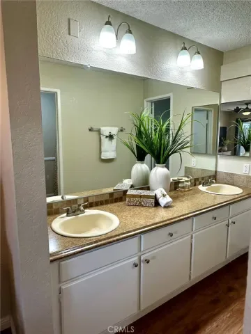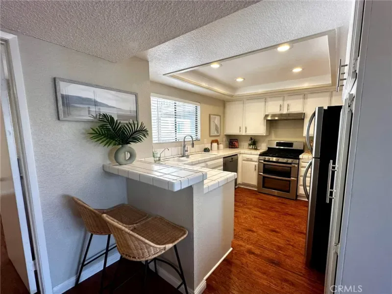 Additional highlights include vinyl wood flooring throughout, an in-unit laundry room with extra storage, a one-car garage, and an additional assigned parking space. Residents enjoy resort-style amenities including tranquil streams and walking paths, two pools, two spas, a clubhouse, and a BBQ area. Ideally located just minutes from Bolsa Chica State Beach, shopping, and dining, this home offers the perfect blend of comfort, convenience, and coastal living.