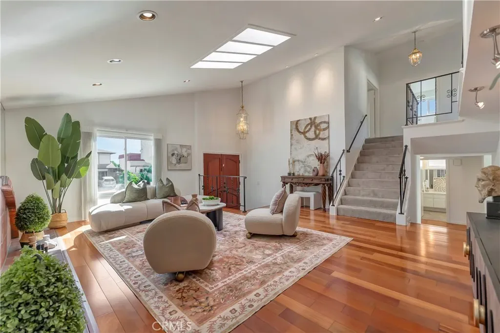 A spacious and distinctive corner-lot residence offering style, comfort, and flexibility in one impressive package. With its striking architecture, lush front lawn, and inviting curb appeal, this home makes a memorable first impression and continues to deliver throughout. Inside, you’re greeted by soaring ceilings, abundant natural light, and beautifully finished hardwood flooring that brings warmth and character to the main living spaces. The sun-drenched living room features dramatic volume, oversized skylights, elegant iron-rail accents, and a statement fireplace that serves as a true centerpiece for gathering and entertaining. The flowing layout offers both openness and defined spaces, making the home feel grand yet comfortable. The kitchen is generously sized and thoughtfully designed with extensive custom cabinetry, granite countertops, stainless steel appliances, a center island, and abundant prep and storage space. Just off the kitchen, the dining area opens seamlessly to the backyard, creating an ideal setup for indoor-outdoor living and easy entertaining. One of the home’s most unique features is its rare basement, an uncommon and highly valuable amenity for a California property. This flexible lower-level space is perfect for a secondary family room, media room, game room, home office, gym, guest retreat, or creative space, offering versatility that is difficult to find in the area. The home’s layout continues with spacious bedrooms, updated bathrooms, and an expansive primary suite that offers a peaceful escape with ample room to relax, along with direct access to a private balcony, perfect for enjoying morning coffee or evening sunsets. Step outside to a generously sized backyard designed for both entertaining and everyday enjoyment. The covered patio provides a comfortable setting for outdoor dining or lounging year-round, while the large grassy yard offers room to play, garden, or simply unwind. The backyard also offers potential for recreational vehicle parking, a standout feature that adds convenience and flexibility for those who need extra space for an RV, boat, trailer, or additional vehicles. A storage shed adds even more utility, and the corner-lot positioning enhances both space and presence. Additional highlights include a dedicated laundry room, multiple indoor and outdoor gathering spaces, abundant natural light throughout, and a layout well-suited for multigenerational living, entertaining, or simply spreading out in comfort.