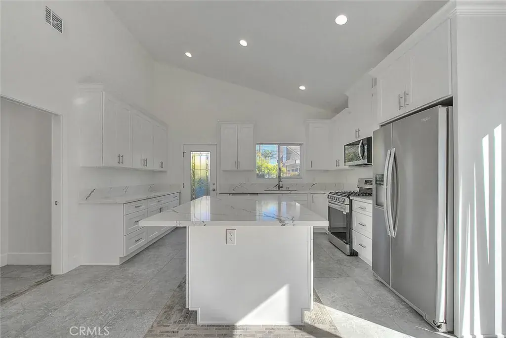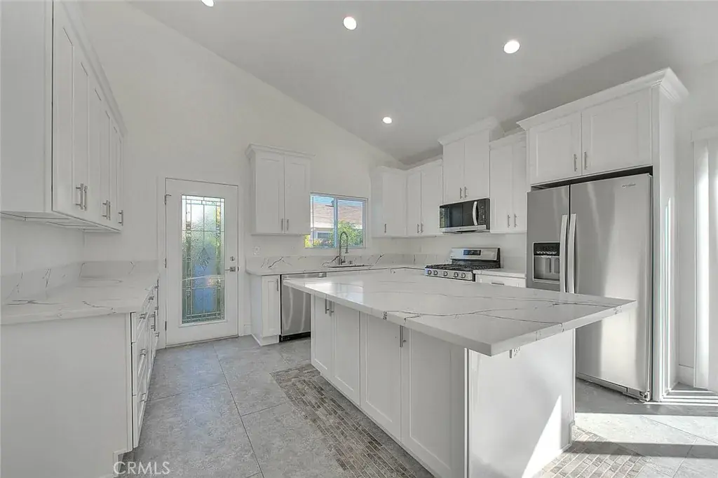 The immaculate kitchen is fully equipped with stainless steel appliances: stove, microwave, washer/dryer, and a side by side fridge. The kitchen boasts high-end cabinetry and quartz countertops, complemented by recessed lighting throughout. Outdoor sensor lights all around.