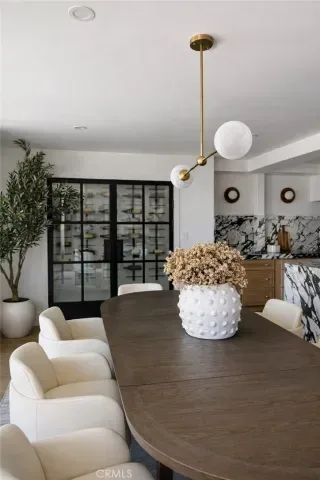 The chef’s kitchen is a true centerpiece, equipped with a Viking range, 60” Sub-Zero refrigerator, dual waterfall-edge Viola marble islands, and two fully outfitted pantries. Designer details continue throughout with a temperature-controlled wine display wall and a sophisticated bar finished with vintage mirrored panels and brass accents.