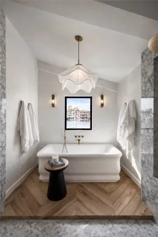 Upstairs, the primary suite offers a private waterfront balcony and a spa-inspired bath with dual walk-in showers and an oversized freestanding soaking tub positioned beside a picture window capturing serene harbor views.