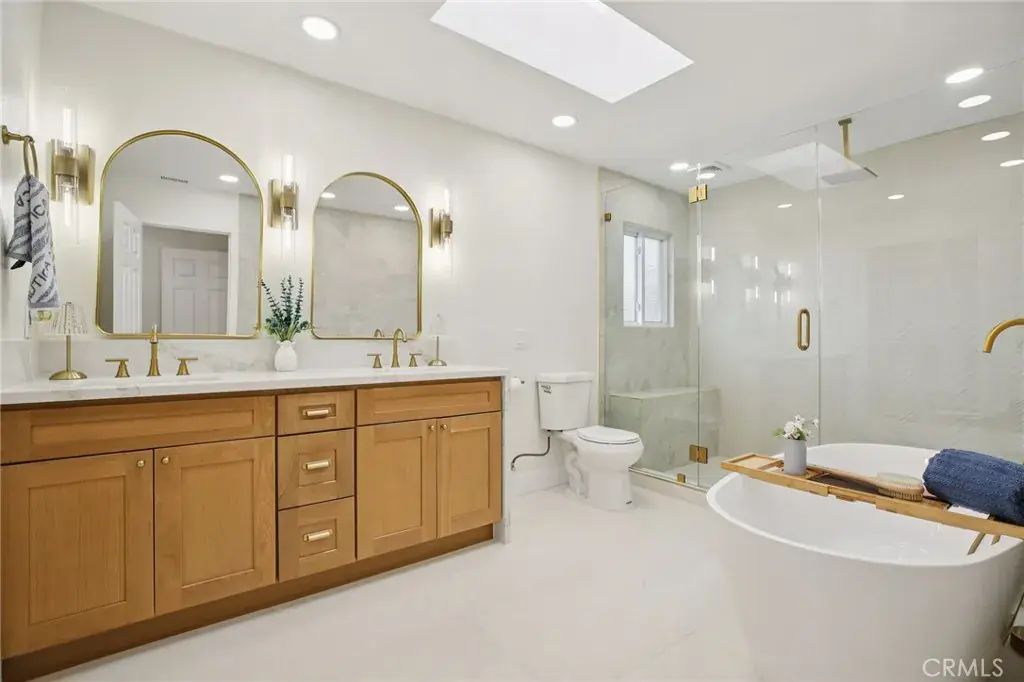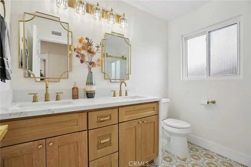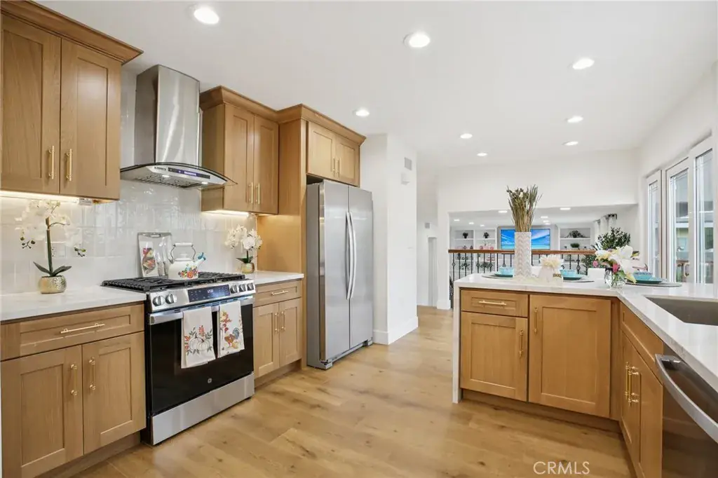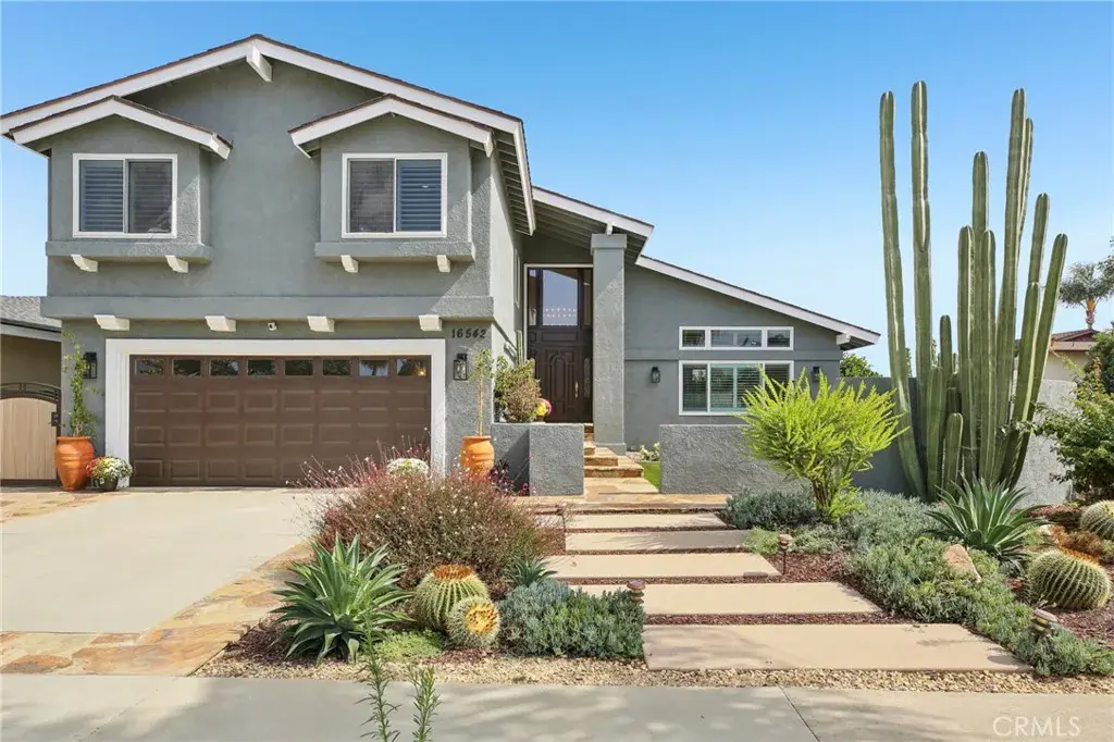 Welcome to 16542 Los Verdes Drive, a meticulously maintained two-story home in the heart of Huntington Beach. This spacious 5-bedroom, 3-bath residence blends luxury design with modern comfort, offering an ideal retreat just minutes from the coast. Step inside to discover all-new hardwood flooring throughout, plantation shutters, and fresh designer paint inside and out. The gourmet kitchen is a showstopper, featuring brand-new, custom cabinetry with under-cabinet LED lighting, a stylish designer backsplash, and new stainless steel appliances. Every bathroom has been completely remodeled with premium finishes. The downstairs bath showcases designer tiles, the upstairs hall bath has undergone a full modern upgrade, and the primary suite boasts a spa-like retreat with a large walk-in shower and a freestanding soaking tub. Outside, the home shines with all-new landscaping in both the front and back yards, highlighted by lush greenery and durable turf grass for easy maintenance. Additional upgrades include a beautifully finished epoxy garage floor and refreshed exterior paint that enhances the home’s curb appeal. Move-in ready and crafted with care, this home offers timeless style and quality in one of Huntington Beach’s most desirable neighborhoods. Don’t miss out on this beautiful Huntington Beach gem!