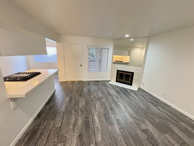 * Living room has recessed lighting, full length mirror and cozy fireplace.