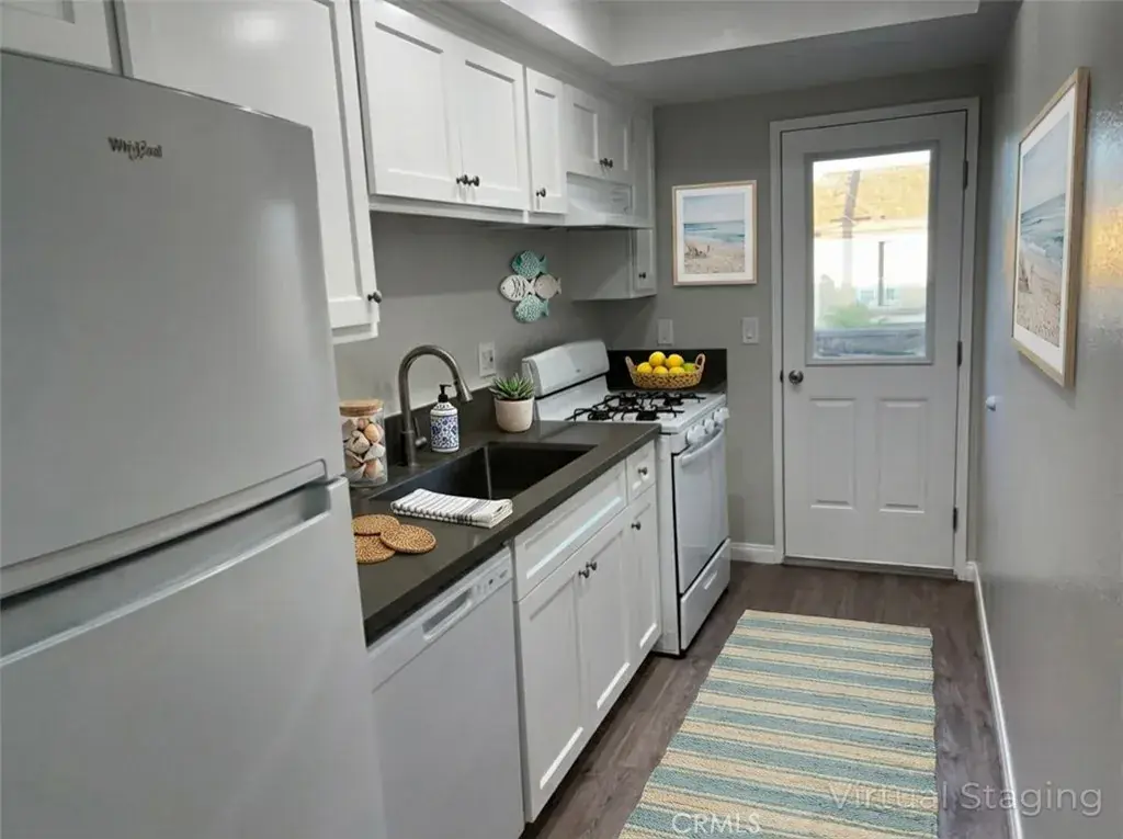 This stylishly updated second-floor end unit features a brand-new kitchen with quartz countertops, a gas range, and a new refrigerator. The home offers new laminate flooring throughout, recessed lighting, dual-pane windows, and fresh interior paint for a clean, modern feel. Enjoy a private balcony and the advantage of an end unit with only one shared wall and no neighbors above. A rare highlight of this property is the parking: the unit includes a private detached garage plus an additional assigned parking space, providing exceptional convenience and flexibility. The intimate, low-density building of just six units also includes on-site community laundry. Ideally located minutes from the beach, wetlands, Huntington Harbour, and nearby shopping, dining, and grocery options. Rent includes trash, water, and sewer.