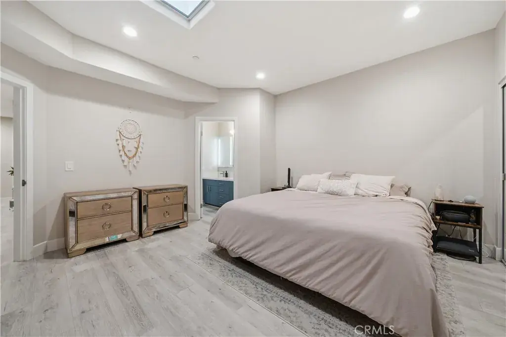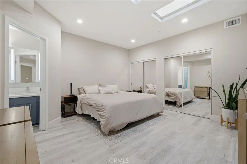 The very large bedroom features wall-to-wall mirrored wardrobe doors, a double skylight, and windows that bring in exceptional natural light. The spacious dual-sink bathroom is beautifully upgraded with tasteful finishes. The home also includes recessed LED lighting throughout.