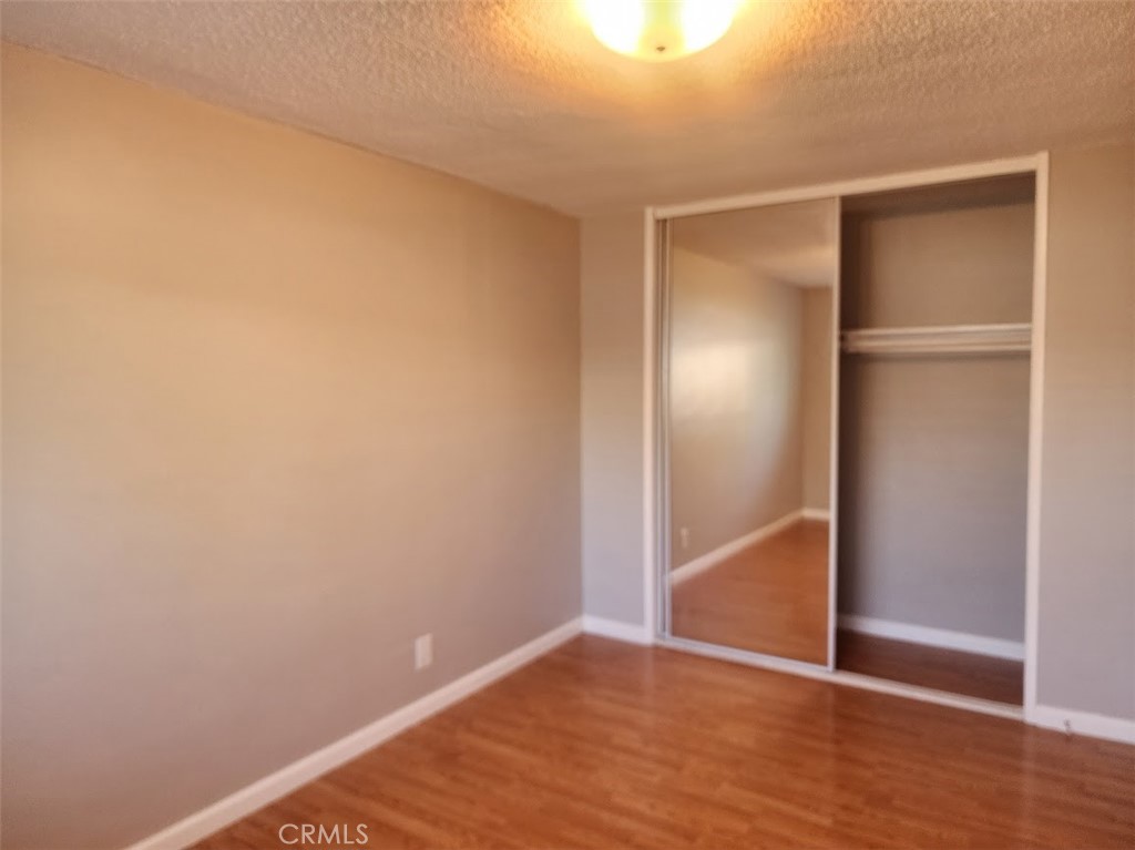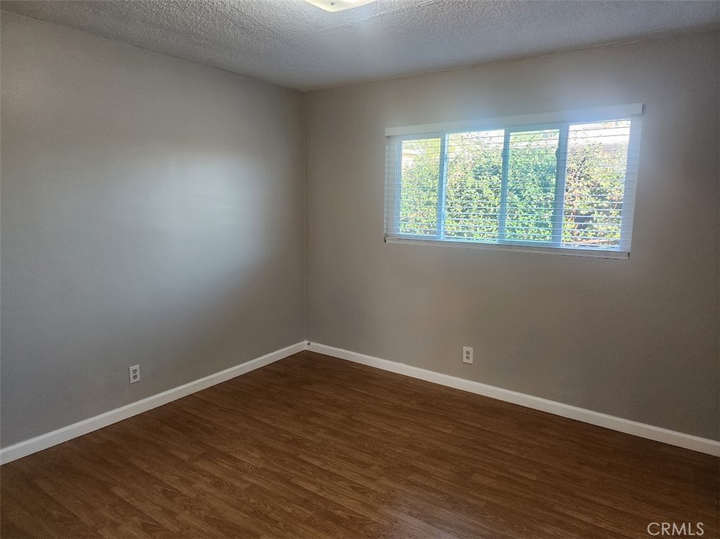 Both bedrooms are generously sized and feature laminate flooring throughout. The bathroom includes a shower-over-tub combination and a single-sink vanity.