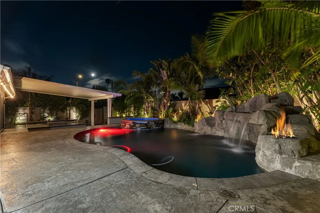 Absolutely stunning oasis on a quiet 40 foot RV access corner lot in a prime location. Entertainers delight. You will fall in love! Upon entering, you are welcomed into a grand foyer with soaring ceilings and an abundance of natural light. The open-concept floor plan seamlessly connects the living, dining, and kitchen areas, creating a harmonious flow throughout the home. The heart of the home is the chef’s kitchen, boasting high-end stainless steel appliances, custom cabinetry, quartz countertops, and a spacious island with bar seating. Overlooking the pool make this kitchen as functional as it is beautiful. Whether you’re preparing a casual meal or entertaining guests, this kitchen is equipped to handle it all. The primary suite is a sanctuary of luxury, featuring a spacious layout, private access overlooking the pool, and a spa-like en-suite bathroom. The master bath includes a walk-in shower, custom vanity, and a large closet. Additional bedrooms are generously sized, each with its own unique charm and ample closet space. The home’s bathrooms are equally impressive, with high-end fixtures, custom tile work, and modern finishes. Step into the backyard, where an entertainer’s paradise awaits. The sparkling salt water pool, spa, slide, and waterfall is surrounded by lush greenery, king palm trees, and custom stonework that is perfect for both relaxation and recreation. An adjacent spa offers a tranquil retreat, while the covered patio with built-in BBQ and outdoor kitchen is ideal for hosting gatherings. Gorgeous outdoor kitchen that has a sunken bar with a sink, beer tap, Bull BBQ rotisserie, & fridge. Huge aluminum covered patio with insulation. Stamped colored concrete that exudes luxury. Some of the amazing upgrades include New windows, sliders, skylights, A/C split system, New gates, Tankless water heater, custom block wall, and custom lighting through out.