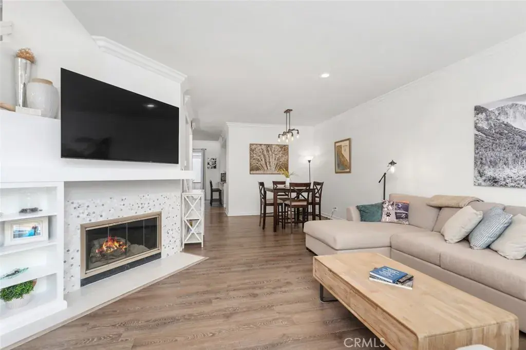 The main level also features two living areas, a gas fireplace, and a retro-chic wet bar, all brought together with stylish hardwood-look plank flooring.