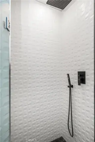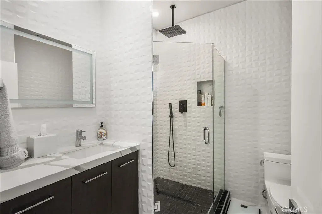 The spacious primary suite offers sunset views, a soaking tub, dual-sink vanity, refined tile finishes, and a custom-organized closet. The secondary bedroom is a private en-suite with its own bath and glass walk-in shower—ideal for guests, roommates, or a home office.