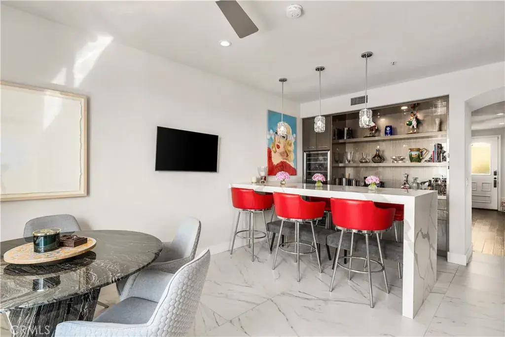 The interior has been thoughtfully upgraded with wide-plank flooring, quartz countertops, custom cabinetry, and designer finishes throughout. The open-concept kitchen features stainless steel appliances, an oversized quartz peninsula with seating for six, custom bar area with wine fridge, and ample storage—perfect for entertaining or relaxed evenings after a beach day.