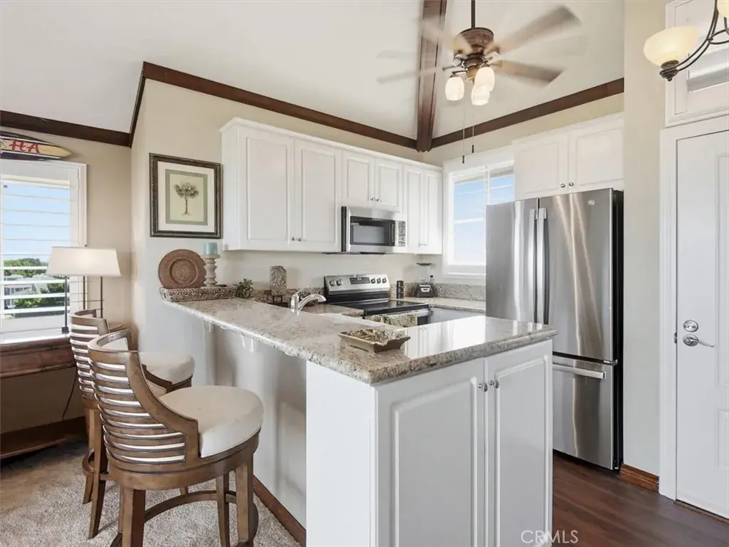 Embrace refined beach-lifestyle living in this fully remodeled studio penthouse in the coveted Seabridge Villas community, Huntington Beach. Vaulted ceilings, abundant natural light and 270° panoramic views from ocean to mountains set the scene. Inside, the design seamlessly blends plush living-room carpet with rich, wood-grain laminate in kitchen and bath. The loft level accommodates either a queen-bed retreat or home office, with new staircase, bonus closet, sliding doors and decorative railing. A finished attic closet features mahogany shelving + LED lighting for elevated storage. The chef’s kitchen is upgraded to the max: marble countertops, luxury-grade flooring, refinished cabinetry and brand-new stainless appliance suite. Utility upgrades include copper plumbing, insulated ductwork, automatic air-bleed valves and dedicated service receptacle — fully modernized systems.