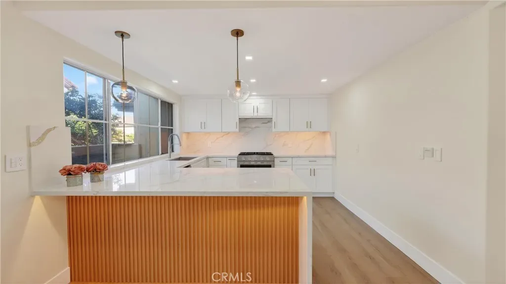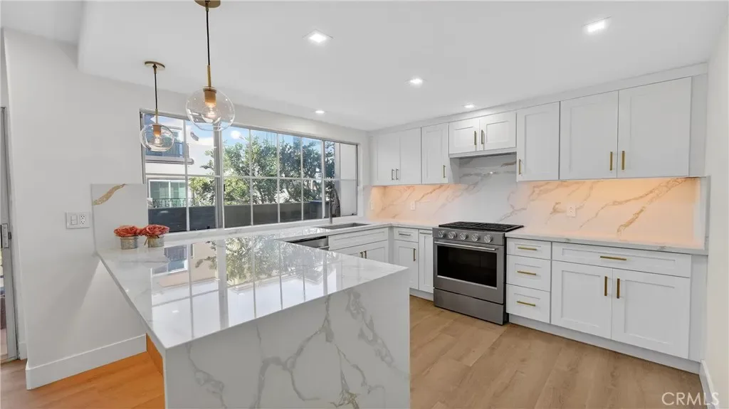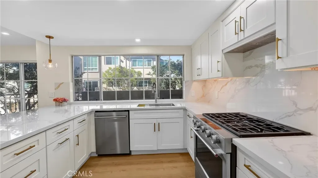 The fully remodeled kitchen boasts brand-new stainless steel appliances, durable quartz countertops with