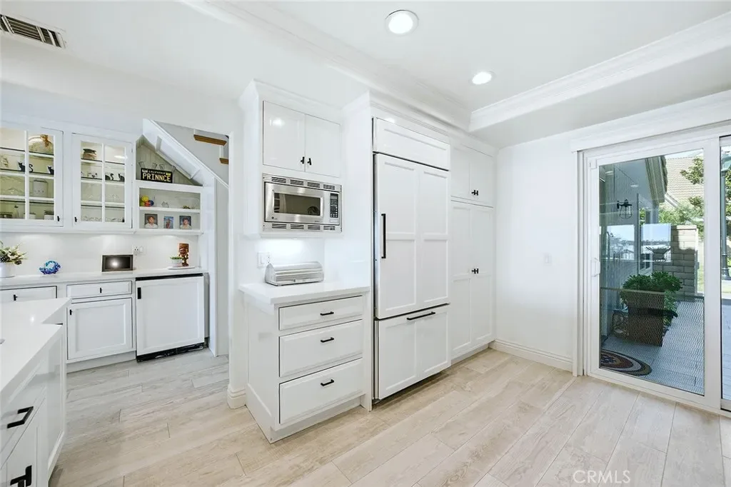Low-maintenance wood-inspired porcelain tile spans the first floor, while accordion slider doors frame the view of the oversized waterfront deck. Spacious kitchen enjoys blue water views and is equipped with quartz countertops, a Viking stove with gas cooktop, and a built-in refrigerator. Newer recessed lighting has been added throughout most rooms.