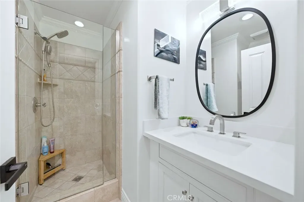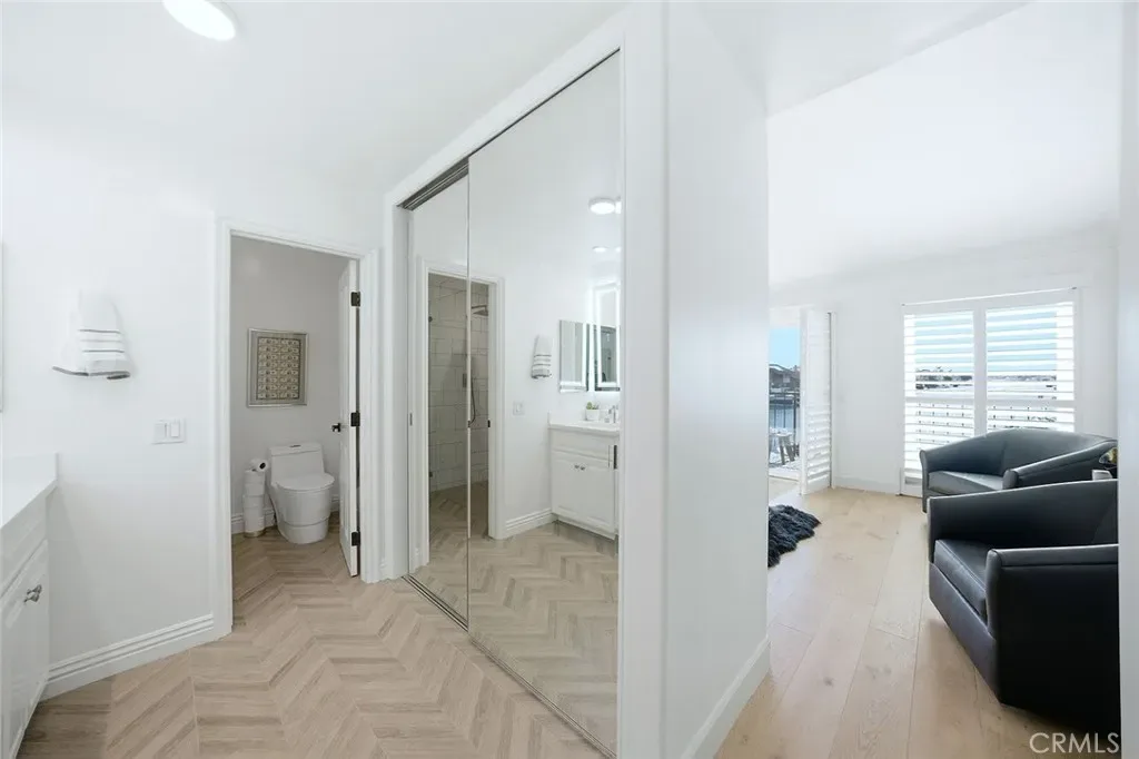 Primary suite upstairs features a large balcony with expansive harbor views, dual vanity sinks, quartz countertops, and a beautifully remodeled shower.