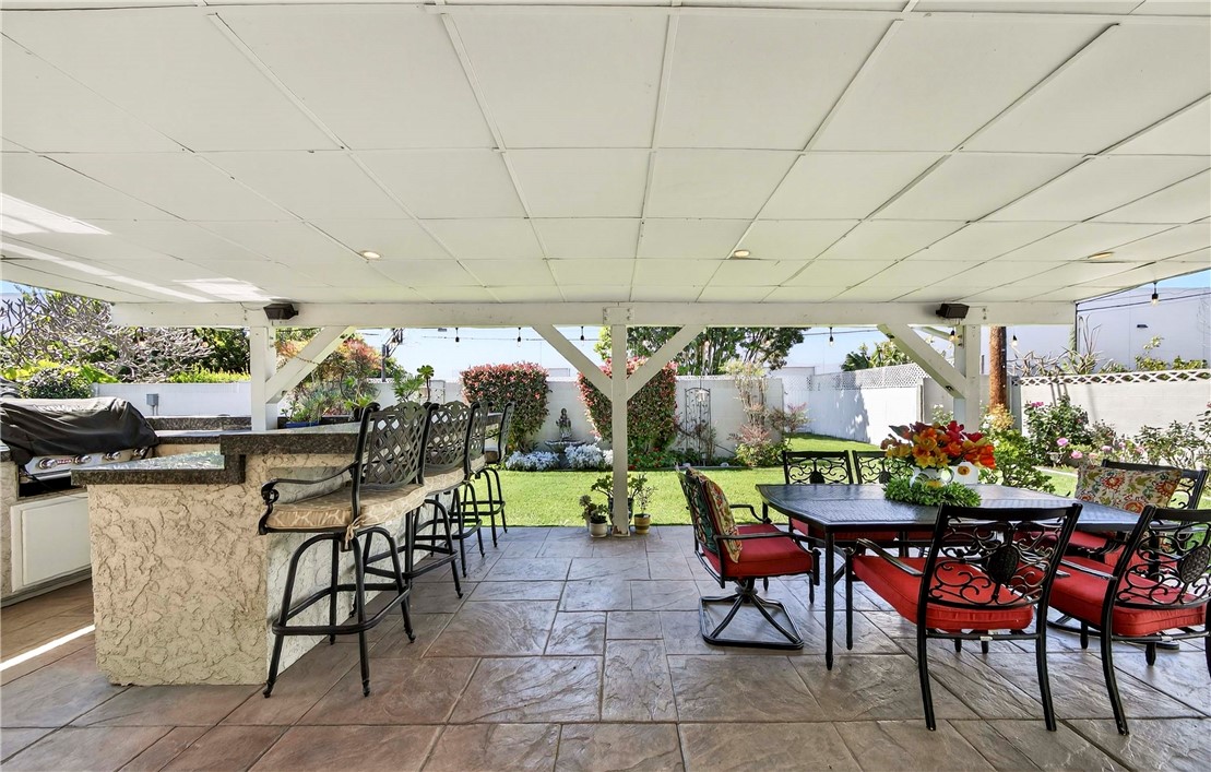 Step inside to an open, entertainer-friendly floorplan, where the spacious living room flows seamlessly into the updated kitchen and dining area. The dining space opens to an expansive covered patio—perfect for gatherings—with a built-in BBQ island, ample counter space, and bar seating. The patio easily accommodates multiple tables for hosting guests, and just steps away, you can unwind in the nearly new outdoor spa.