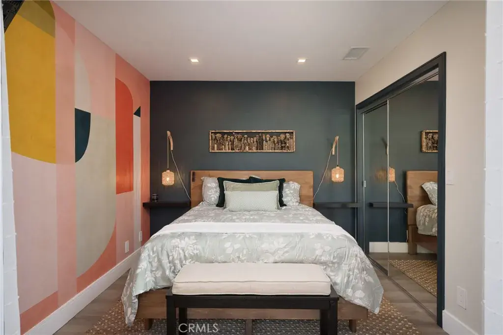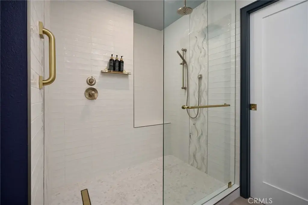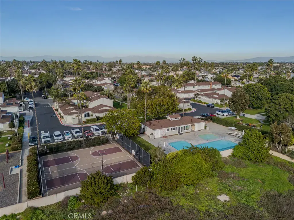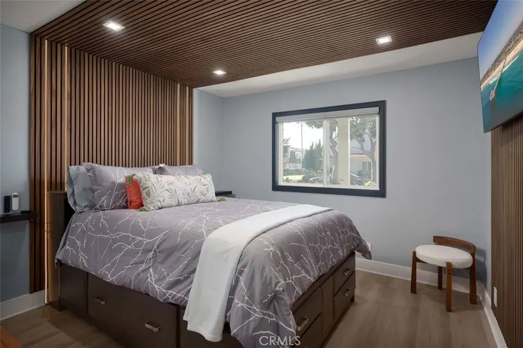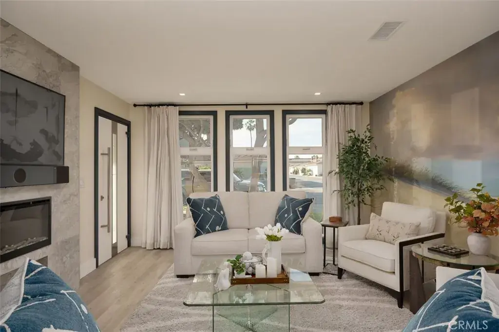 Thoughtfully remodeled coastal-modern home offered furnished with refined finishes and seamless indoor-outdoor living. The chef-grade kitchen features WOLF appliances, a panel-ready refrigerator integrated into custom cabinetry, quartz countertops with full-height backsplash, undermount sink with brass-tone fixtures, open shelving, soft-close cabinetry, and a large window overlooking the private courtyard—ideal for both everyday living and entertaining. The bright, open living area offers abundant natural light, consistent flooring throughout, and a statement stone fireplace with wall-mounted TV integration. The primary bedroom retreat includes a custom vertical wood-slat accent wall with integrated LED lighting, built-in nightstands, recessed lighting, and TV-mounting capability. The guest bedroom features a designer accent wall, pendant bedside lighting, and a built-in open closet system—perfect for guests, office, or flex space. The bathroom features a large walk-in glass shower with linear drain, rain shower head, and handheld fixture, designer tile with textured accent panels, a dual vanity with integrated sinks, modern cabinetry, brass fixtures, and designer mirrors. The fully enclosed private courtyard is a true outdoor living space, built on a concrete pad with large-format pavers, outdoor bar seating off the kitchen, fire pit area, and zero lawn maintenance—functioning as an extension of the interior living space. Additional upgrades include new HVAC system, new electrical, and new plumbing. Finished garage includes epoxy floors, extensive built-in shelving, custom base cabinets with butcher-block-style countertop, and washer/dryer. Strong curb appeal on a quiet residential street, minutes to Huntington Beach, shopping, dining, and easy access throughout Orange County.
