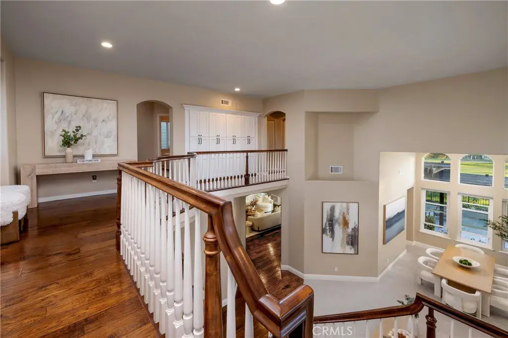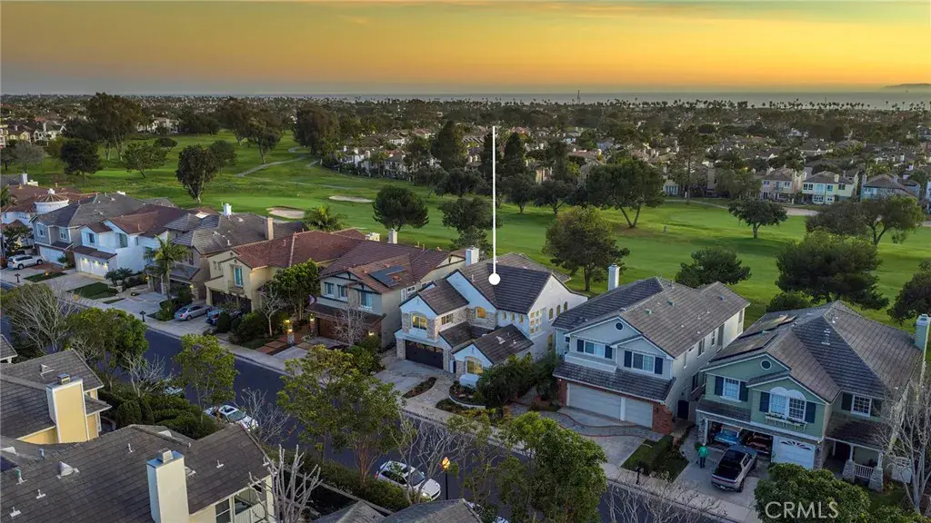 Set along a premier stretch of the Huntington Club Golf Course within the guard-gated enclave of The Peninsula, this exceptional coastal residence captures sweeping fairway views, vibrant sunsets, and an ideal orientation that fills the home with natural light throughout the day. Positioned on a quiet interior street with no residences directly opposite, the property offers enhanced privacy and a heightened sense of openness. All just moments from neighborhood parks, scenic wetlands trails, the shoreline, and award-winning SeaCliff Elementary School. Spanning over 3,000 square feet, the thoughtfully designed floor plan includes four bedrooms, with a desirable main-level suite, and an upstairs loft ideal for a home office or secondary lounge. The family room, anchored by a fireplace and custom media cabinetry, opens seamlessly to the kitchen and outdoor living spaces. The recently refreshed kitchen features quartzite countertops, premium stainless steel appliances, a generous breakfast bar, and a sunlit breakfast nook overlooking the golf course. Upstairs, the expansive primary suite enjoys sweeping fairway views from a private balcony and a beautifully remodeled bath with dual vanities, walk-in shower, Japanese soaking tub, and a spacious walk-in closet. Secondary bedrooms are generously sized and share an upgraded bath.