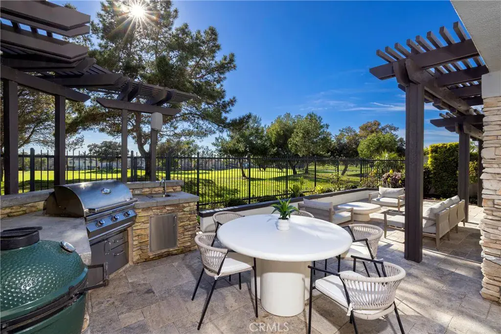 The rear grounds are designed for relaxed coastal living and entertaining, complete with a built-in BBQ center, professional hardscape and landscape design, custom lighting, and low-maintenance finishes—all set against tranquil golf course vistas.