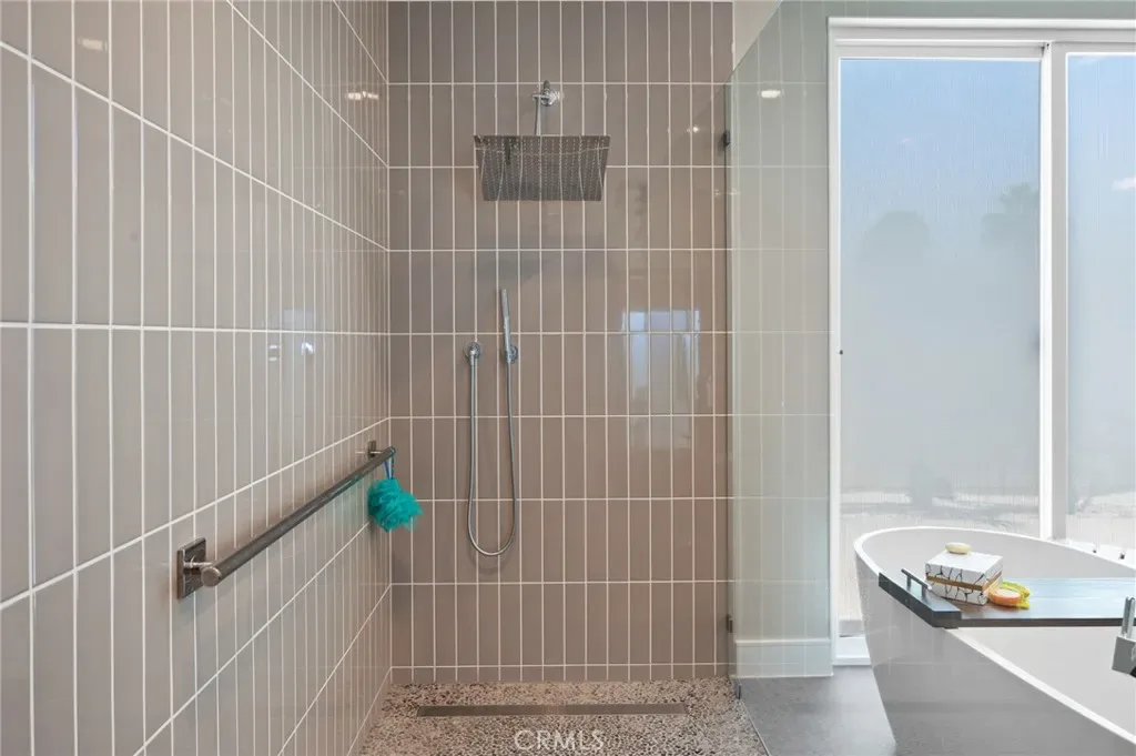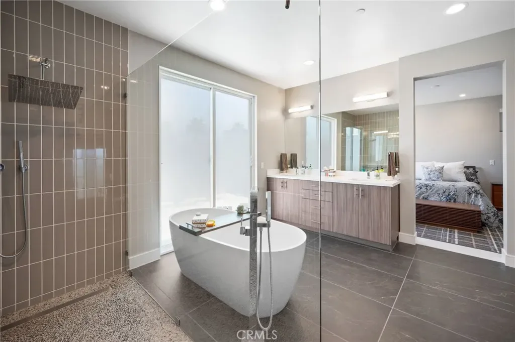 The primary suite offers a true retreat with a spa-level bath including a deep soaking tub, zero-threshold rain shower with private patio access, and a custom walk-in closet designed for functionality and elegance.