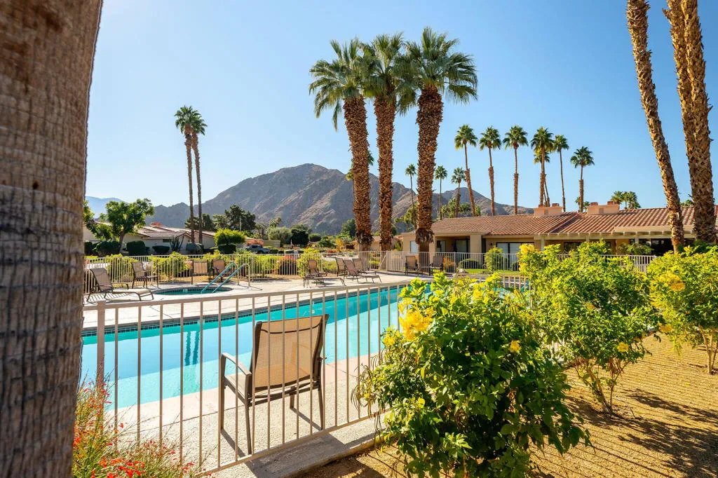 Indian Wells, Casa Rosada in gated Mountain Cove. 3 bd. 3 bth condo with south- facing patio showcasing the Little Santa Rosa mountains. Entry gate opens to the newly paved courtyard with wooden double doors opening into the fully remodeled interior. Quality renovation in a stylish, modern, open design. Waterproof Luxury Vinyl wood flooring throughout; new cabinetry, quartz counters, kitchen island for 6. All new fixtures and appliances. Large primary ensuite with standing tub and generous master closet. Guest ensuite and 3rd bedroom with adjacent hallway bath creating a private second guest opportunity. The south-facing patio is steps to the main heated pool and spa. HOA covers landscaping, exterior maintenance including roofs, painting and pools. This roof replaced approx. 3 yrs ago. There are 4 pools and spas within this 50-unit complex. Drive your golf cart to the Indian Wells Country Club, the tennis garden or two of the city owned golf courses. As an Indian Wells resident, you enjoy low golf fees, free access to the Hyatt work-out Facility and 20% discount on restaurants in the hotels. Also enjoy one free day at the BNP Paribas Tennis tournament and other perks. Lower priced electricity through Imperial Irrigation. Come and immediately enjoy the special Indian Wells Lifestyle! Showings to begin on April 7, 2026.