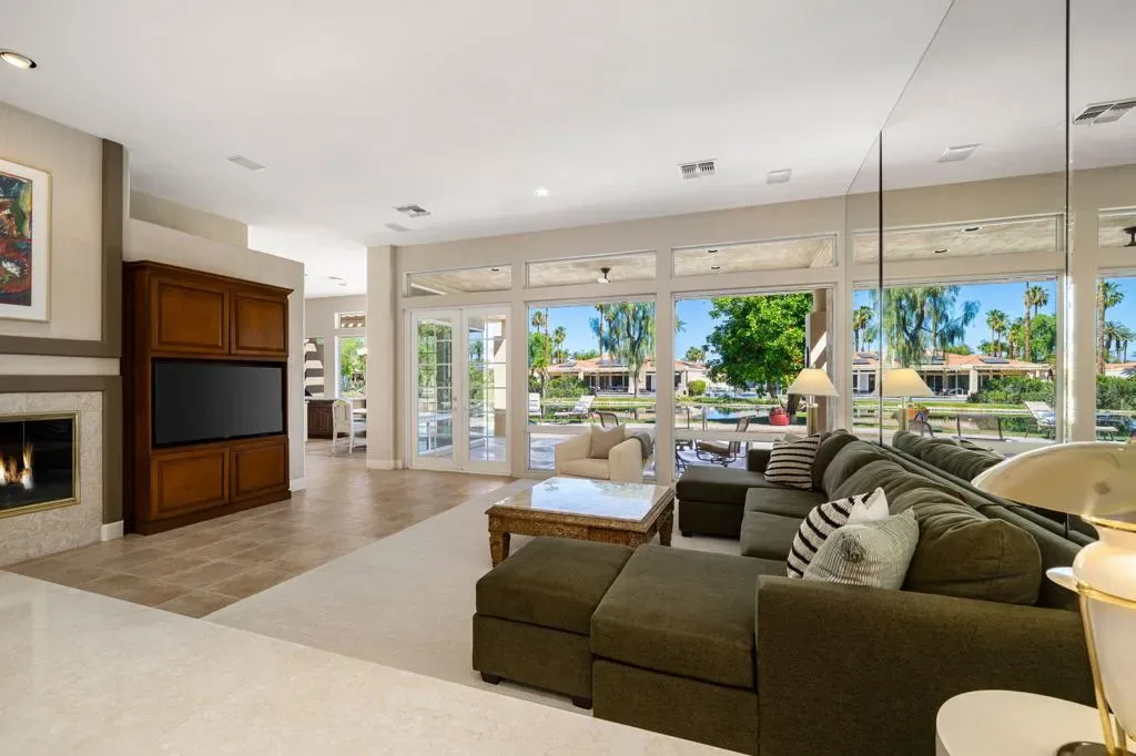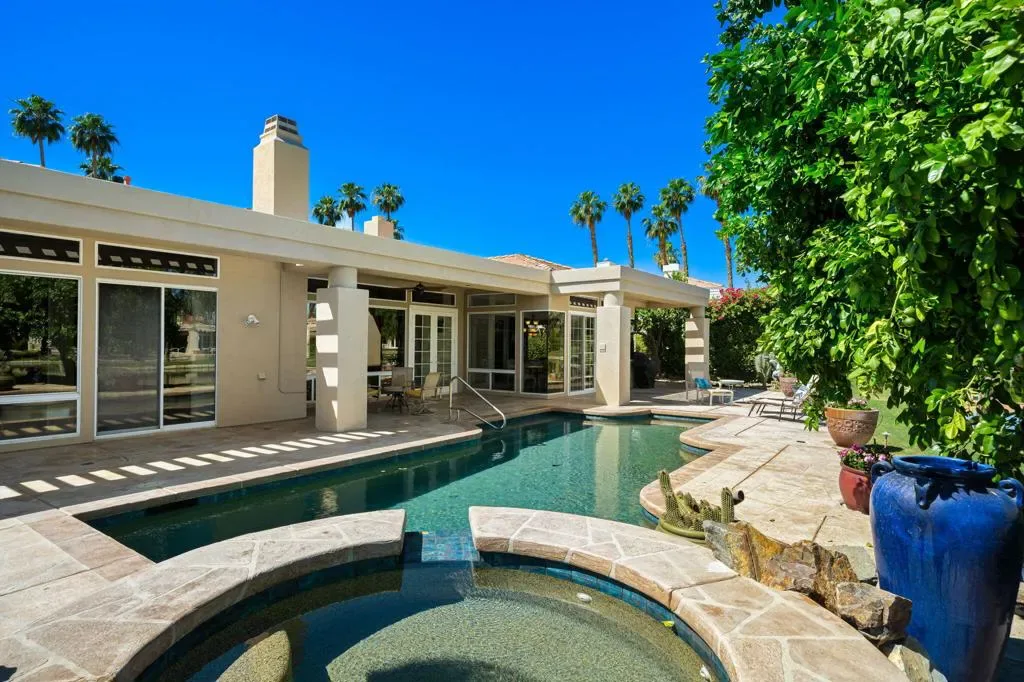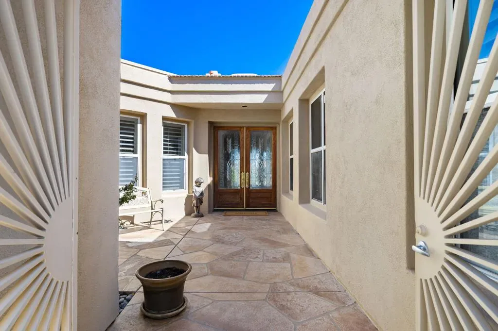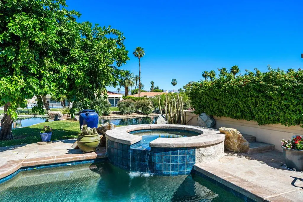 Located in the crown jewel of Coachella Valley, Indian Wells, this home is among the largest currently available in Desert Horizons CC. The uniquely situated property lies between an 18-hole putting green directly across the street, and a tranquil, poolside pond at the rear, creating the essence of a private resort within a resort. Inside, architectural qualities include an abundance of windows filling the interior with natural light, high ceilings, large, roomy rooms, an exceedingly spacious primary bedroom/bath suite, and 3 fireplaces. Religiously maintained by the original owner, an important series of upgrades include complete patio and courtyard redecking (2004), refreshed in 2014; upgraded kitchen cabinetry (2012) and stovetop (2020); new A/C units (2014) with one replaced (2024); a Navien tankless water heater (2025). Laundry room includes washer and dryer. The very sizeable patio has multiple lounging areas, with the pool ideally positioned for all-day sun exposure. The garage offers extensive built-in storage cabinetry, epoxied floors, and accommodates two full-size vehicles plus a golf cart, which is INCLUDED IN SALE!