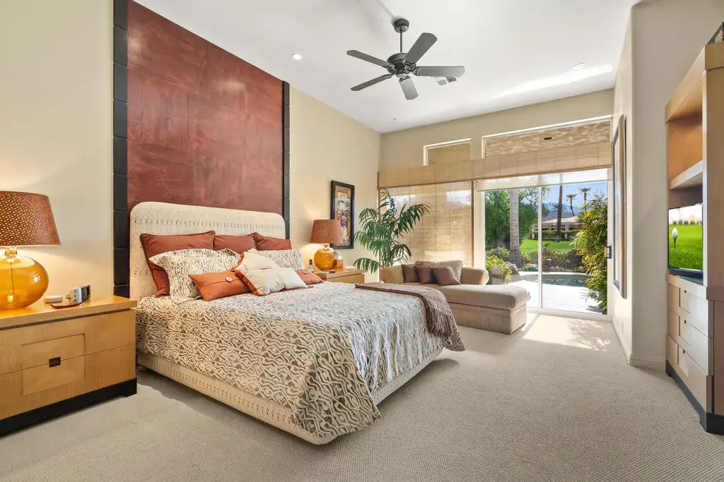 A beautiful home on a fabulous expansive south facing lot with endless views of the Santa Rosa Mountains, a lake, a waterfall and a private pool and spa. This rarely marketed Riviera floor plan offers 4 bedrooms (including a freestanding casita being used as an office) and 4.5 baths and 3 fireplaces. Enter the front courtyard through double, cut glass, doors and you are welcomed by a lovely water feature and a beautifully decorated home. The Riviera floor plan offers a formal living room, formal dining room, separate family room and an eat-in gourmet kitchen with island bar. This special home has upgraded finishes including granite counter tops, designer grade appliances, including an expanded primary bedroom suite closet to die for!. You will want to see this beautiful home in an outstanding Indian Wells location. Home is being offered partially furnished and some of the furnishings in the photos have been removed. Shown by appointment only.