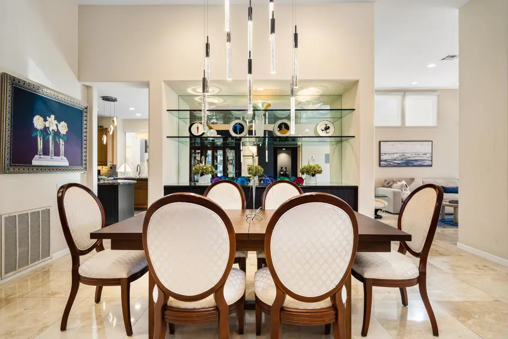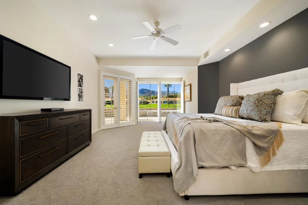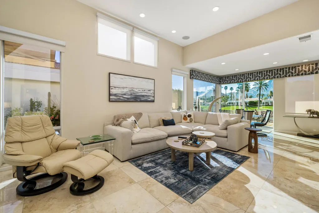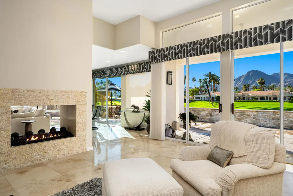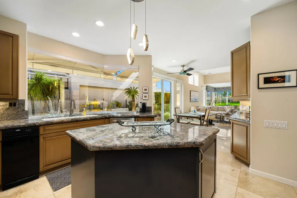 Positioned on one of the premier South-facing interior lots, this exceptional residence captures sweeping, unobstructed views of the 17th fairway, tranquil lake, and dramatic Mountain backdrop. Perfectly situated near the end of a quiet cul-de-sac, the home enjoys an elevated vantage point that maximizes sunlight and showcases the shimmering water, lush green, and surrounding landscape–arguably one of the finest view locations in the community.This beautifully remodeled Hazeltine Floorplan offers approximately 3,400 square feet of refined living space, including 4 bedrooms and 4.5 baths, with a private freestanding casita. Designed to embrace its stunning setting, the expansive rear patio is an features a soothing custom water feature across the back patio and ideal orientation for enjoying breathtaking desert sunsets over the fairway and mountains. Inside, the home has been thoughtfully upgraded with travertine flooring, granite countertops, custom cabinetry, and updated lighting throughout, complemented by tasteful designer furnishings. The spacious kitchen opens seamlessly to the living areas, all oriented to capture the spectacular views beyond. The Primary Suite is a private retreat, separate his-and-hers bath areas. Guests are comfortably accommodated in the main home and detached casita, offering both privacy and flexibility.Located just steps from the Community Pool and Spa, this home combines luxury, comfort, and an unmatched view setting–truly a rare opportunity in Desert Horizons.