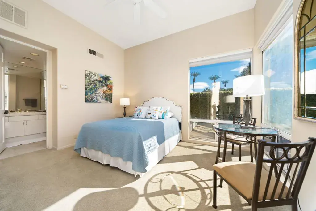Leased through 2026. Spectacular Mountain, Fairway and Lake Views are yours from this former Turnberry model home. As you enter the private courtyard you’re welcomed into this home overlooking the Lake and down the 17th Fairway to the Mountain Vistas. 3 Bedrooms (one is a detached casita), 3 Bathrooms. The Chefs Kitchen has custom cabinets, Granite countertops and newer appliances. There is an adjacent breakfast Nook which opens to the family room. Family Room has a large flat Screen TV. Spacious Master Bedroom Suite with King Bed has a marble shower, spa tub and double vanity. 2nd Guest Room has a Queen bed and adjacent full bath. Casita is the 3rd Guest Room with Queen Bed. Enjoy the Sunsets from the Patio with your own private Spa. Multiple awnings. This corner location has South Views from the Kitchen, Dining Room & breakfast Nook~ all at this premiere Indian Wells Location.