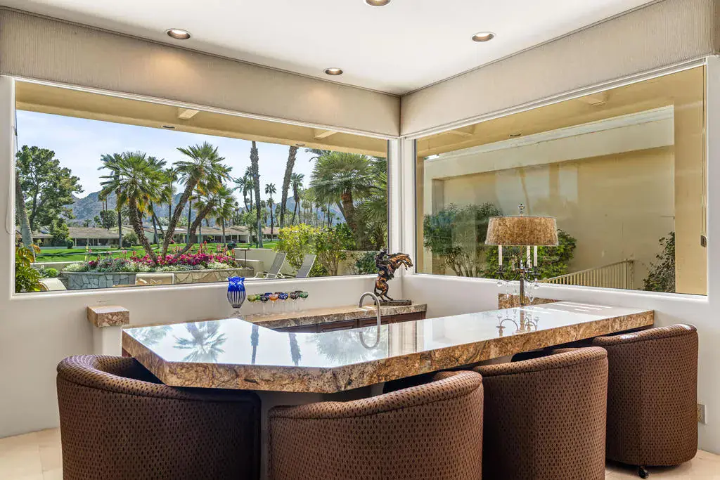 Premier elevated lot overlooking the private pool & spa, wrap around mountain views and the 1st fairway and green at Desert Horizons Country Club. The recently redone Clubhouse, Courts Complex and Exercise Facility are first rate! This Hazeltine floor plan offers almost 3,400 sq. ft. with 3 bedroom suites, a powder room, and a casita with a 4th bedroom. The expansive views are never ending. The generous patio spaces offer a tranquil and private setting overlooking the Pebble-Tec pool/spa with beautiful mountain and golf course views. This sought-after floor plan includes a formal living and dining room, a large family room and an eat-in kitchen. The high ceilings and abundance of windows offer a light & bright airy living space. Located in the heart of Indian Wells this home is desert living at it’s best.