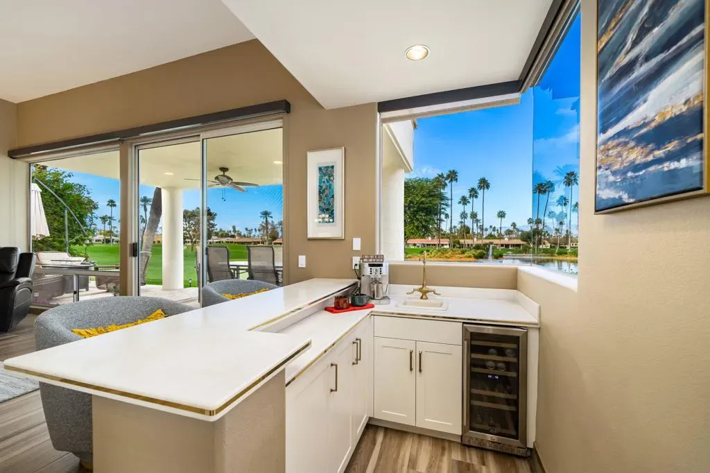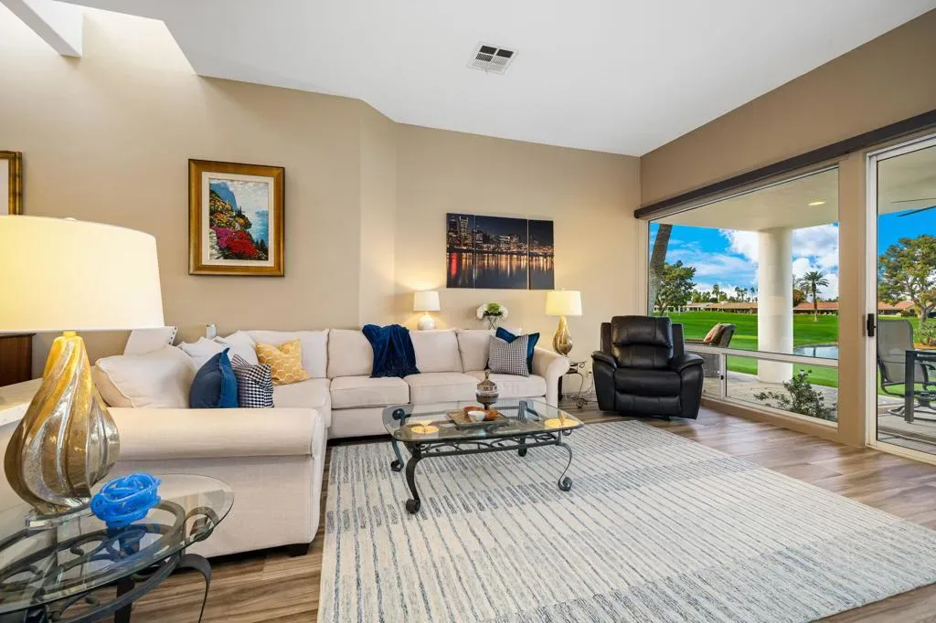 Price Adjustment~Spectacular Lakefront setting with some of the finest views in Desert Horizons Country Club. This lovely furnished 3-bedroom, 3-bath St. Andrews floor plan showcases sweeping Mountain, Lake, and Double fairway views overlooking 6th and 7th Fairways. A private courtyard entry welcomes you into a tastefully appointed home where the Great Room features pristine tile flooring, a fireplace, walls of windows, and a dining area with wet bar–ideal for entertaining. The Chef’s Kitchen has been updated with new appliances and cabinetry, while recent improvements include a newer water heater, new HVAC system, and updated tile flooring. The Primary Suite offers a spa-like retreat with a large walk-in shower, soaking tub, and walk-in closet. A Guest Suite includes an en-suite bath, and a versatile 3rd bedroom may also serve as a Den or Office with an additional bathroom just a few steps away. Step outside to the rear patio to enjoy breathtaking sunset views creating a serene setting for outdoor living and entertaining. Community Pool and Spa just steps away. A 2-car garage plus golf cart garage completes this picture-perfect lifestyle in a premier Indian Wells location. Newly Updated Desert Horizons Country Club–home to world-class amenities; Dining, new Courts Pavilion with 11 Pickleball Courts, 2 Tennis Courts, State-of-the-Art Fitness & Wellness Center, private 18-Hole Golf Course, and an exciting calendar of social events.