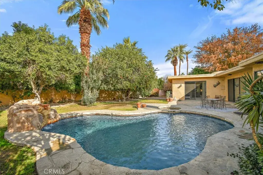 FULLY FURNISHED OR UNFURNISHED / READY TO MOVE IN !!! Desert living at its finest. A custom Furnished Designer Pool Home has been completely remodel and located in one of the finest neighborhoods in the desert. Featuring 3 bedrooms, 2.5 baths, a large office space that can be made into a 4th bedroom, open layout with large living room w/fireplace displaying an artistic water feature, large dinning room, and custom lighting throughout. This home offers a large gourmet kitchen w/breakfast nook, granite countertops, high-end appliances, dual sinks and tons of custom cabinetry. The primary suite is spacious, offering a custom en-suite bath w/jacuzzi jetted tub, walk-in shower, large 4’x4′ skylight and large walk-in closets. Each of the guest bedrooms are spacious and have large closets. The Backyard is complete with Orange, Lemon, Lime, Mango, Pomegranate, Avocado, and Grapefruit trees, a Heated In-Ground Pool & Spa, Spacious Patio & Ample Lounging Space for Resort Style Entertaining. Close to shopping, dining, golfing, tennis, bike trails, hiking, casinos and much more. THIS IS TRULY A RETREAT YOU DON’T WANT TO MISS