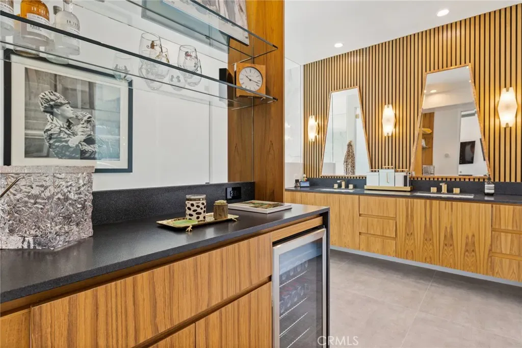 The primary suite is a tranquil retreat, opening to expansive mountain views with direct access to the pool and a private outdoor shower. The spa-inspired bath is richly appointed, complementing the home’s elevated yet relaxed aesthetic.