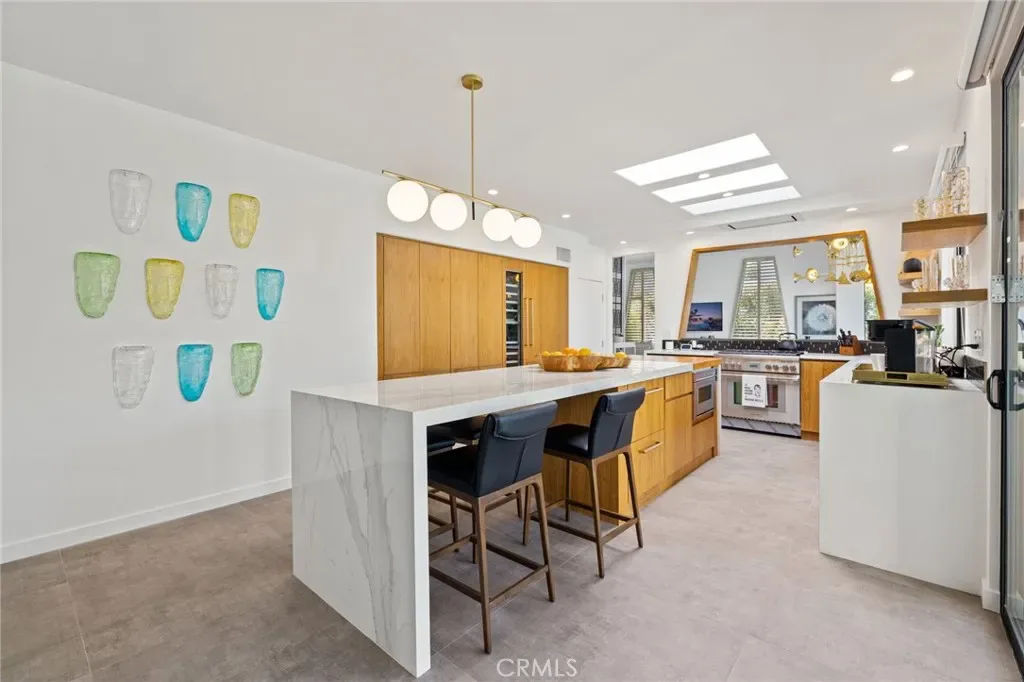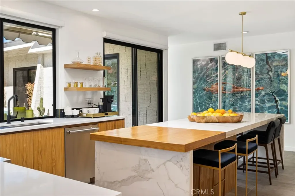 Towering walls of glass flood the great room with natural light, revealing soaring ceilings, curated art walls, and sweeping desert and mountain views. A teak-clad chef’s kitchen appointed with Thermador appliances and an adjacent den overlook the living space, enhancing the home’s sense of scale and connection.