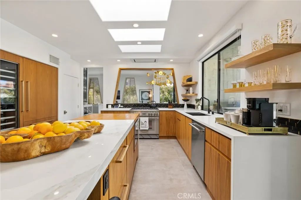 Offering four bedrooms (one currently styled as a den/office) and four baths, the residence also includes custom teak cabinetry, generous storage, a walk-in pantry, laundry room, indoor and outdoor fireplaces, an outdoor bar with built-in BBQ, and an oversized 2.5-car garage.