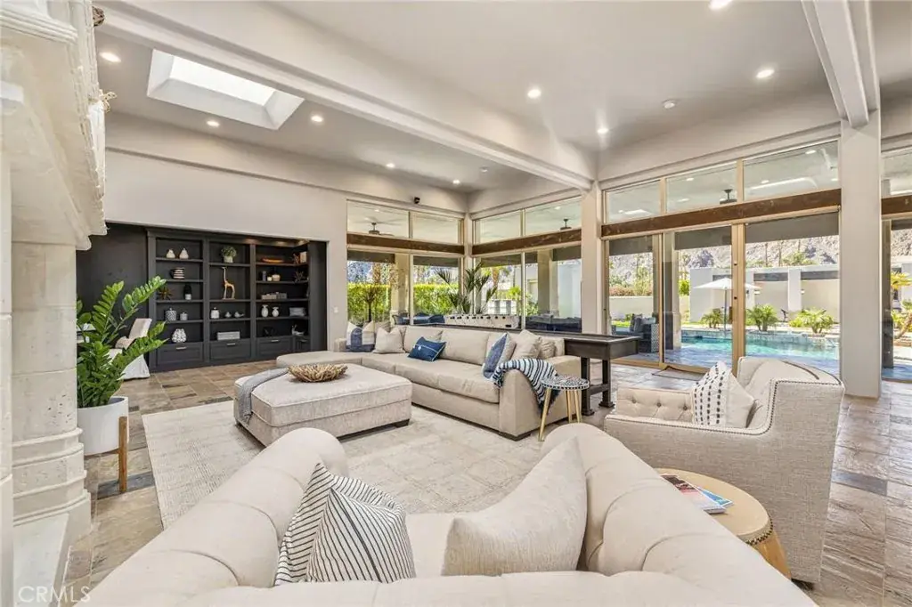 Available December and January, RENTED FEB-MAY 2025 Enjoy Panoramic Mountain Views from this sprawling one-acre renovated estate ideal as a family compound or entertainer’s paradise located in the Guard Gated community of Indian Wells. This spacious contemporary Ministrelli-built residence has an enormous guest house equipped with a large great room, full bar, and 2 guest bedrooms with ensuite baths. Laundry room, pool table, shuffleboard. The main house has a living room w/ fireplace vaulted wood-beamed ceilings, dining room, wet bar, designer kitchen w/ stainless steel Miele appliances, family room of kitchen area, Primaray suite with two separate walk-in closets, stand-alone bathtub, walk-in shower, luxurious guest bedrooms with ensuite bathrooms. Laundry room, 3 car garage, golf cart. This ultra-private property inside and out has all-new landscaping, lighting, rock and stone waterfall fountains, sunken tennis/pickleball court, bocce ball court, large pebble-tee pool, spa with fountains, and Cul de sac location. Indian Wells is located near El Paseo and many other numberer shops and restaurants.