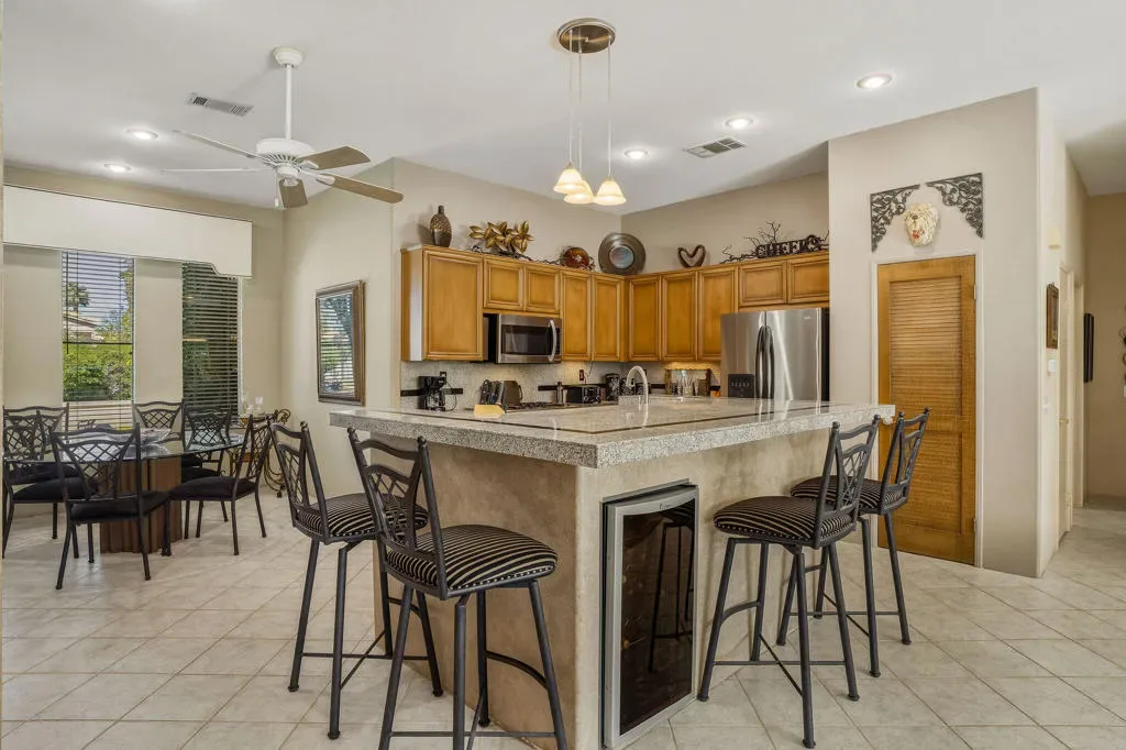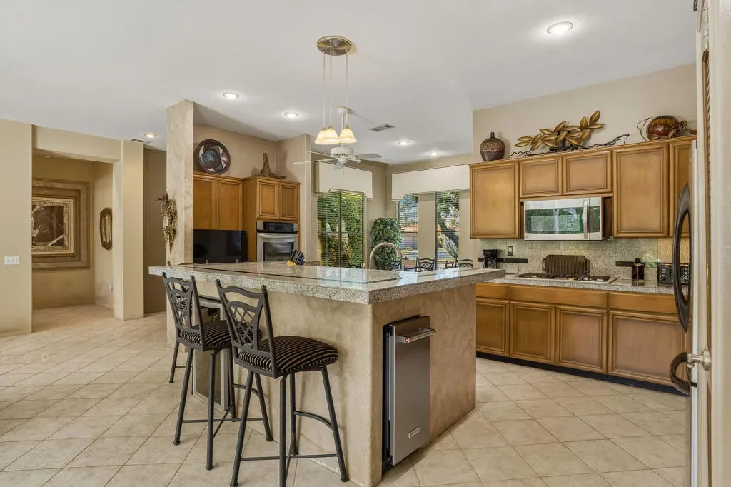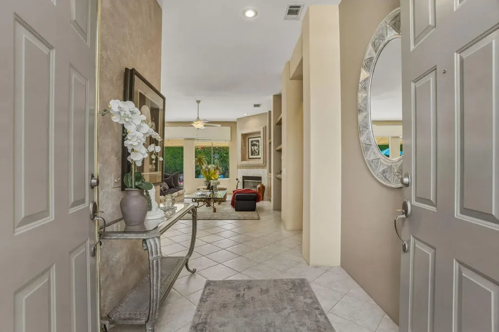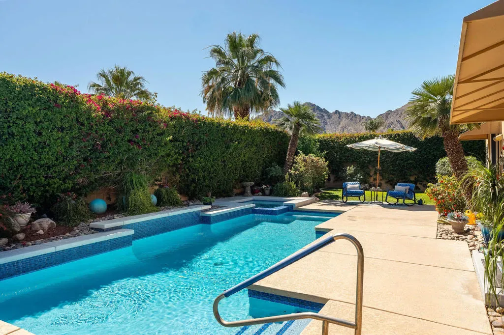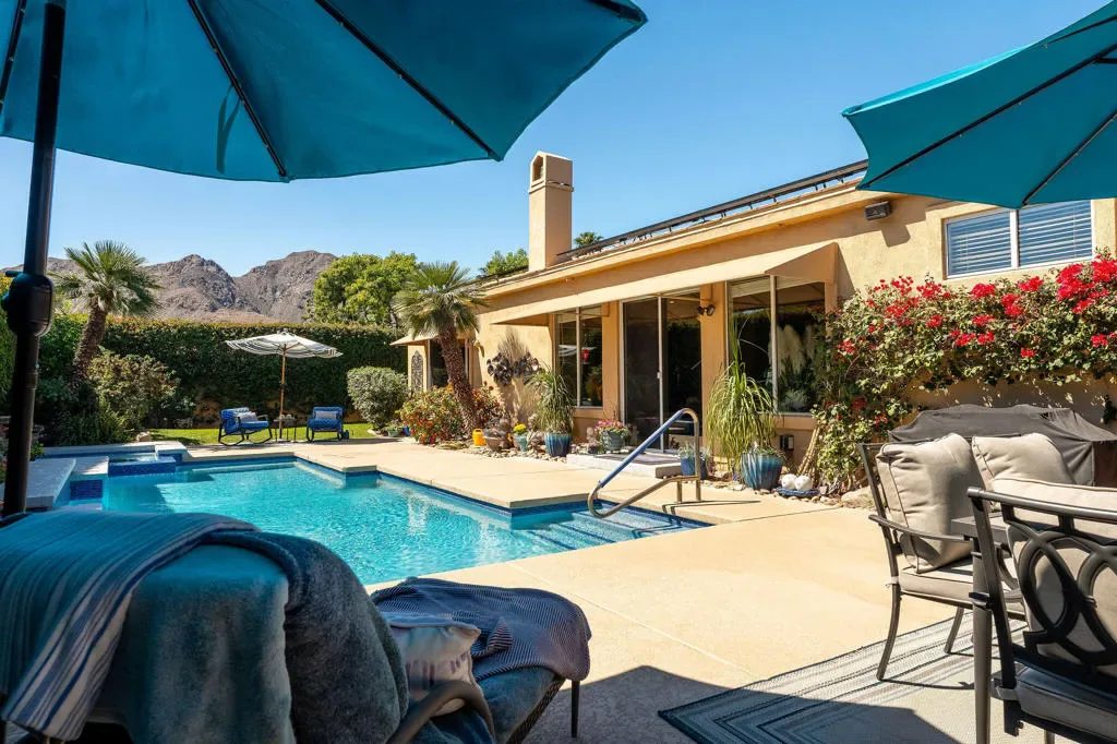 Luxury home in the Indian Wells Country Club with low HOAs of $65. monthly! 3 bedrooms and baths. Formerly, 4 bedrooms, now has a wall removed to make an extended primary suite with office. The third bedroom is a casita with outside access. Enter through the pavered courtyard with ample seating. The front door leads into an entrance into the open great room with fireplace looking out to the pool. Great room opens to the large kitchen island with Granite tile; built in wine fridge and sink and a separate eating area. Sliders from the great room and bedroom lead onto the large patio and private salt-water pool and spa. The pool has been newly sandblasted and tiled. BBQ on patio hooked up to natural gas. Have dinner on the inviting patio looking towards the south mountain views. Enjoy the large manicured outdoor space dotted with fruit trees. 3 car garage with storage. The HVAC system is approx. 4 years old. Enjoy the perks for Indian Wells Homeowners with low golf fees, discounts on restaurants; use of the Hyatt Fitness Center, one free day admission to the BNP Paribas Tennis and more. Home is within the gates of the private Indian Wells Country Club (Invited) which can be joined very reasonably and then start to enjoy being part of the Fun Club of The Desert. This house shows impeccably. Enjoy the beauty of this home with all the benefits. Come live the lifestyle!
