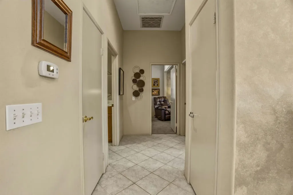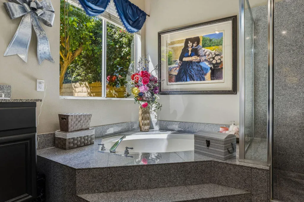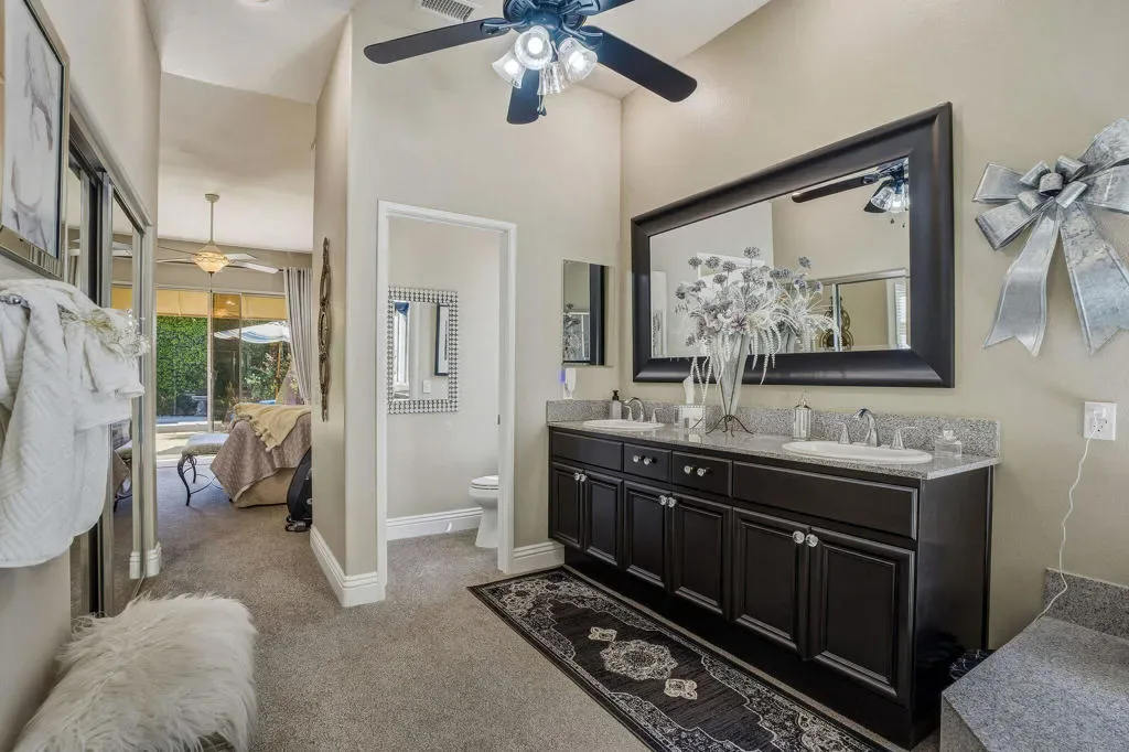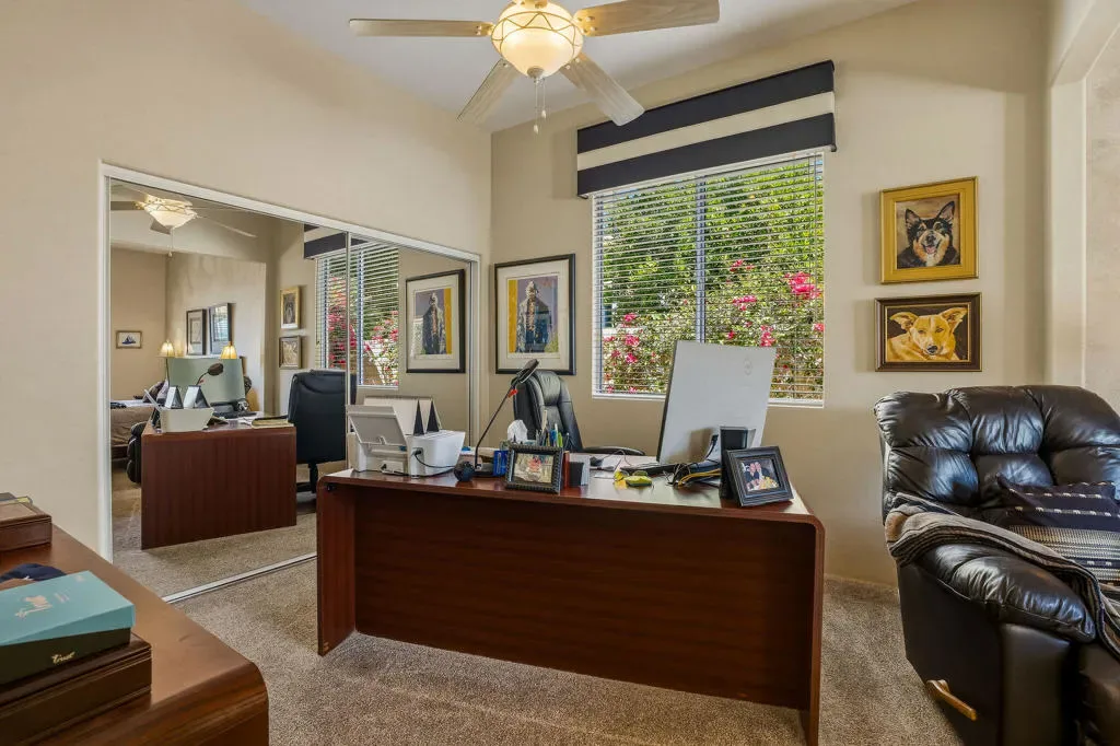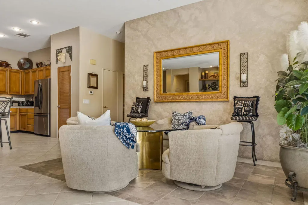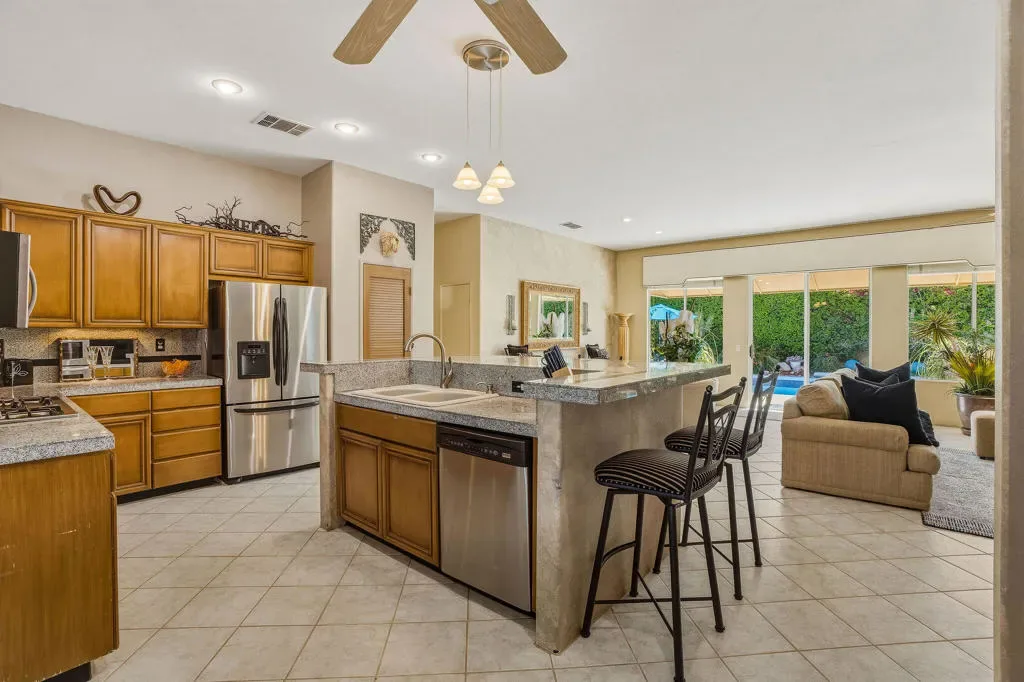 Luxury home in the Indian Wells Country Club with low HOAs of $65. monthly! 3 bedrooms and baths. Formerly, 4 bedrooms, now has a wall removed to make an extended primary suite with office. The third bedroom is a casita with outside access. Enter through the pavered courtyard with ample seating. The front door leads into an entrance into the open great room with fireplace looking out to the pool. Great room opens to the large kitchen island with Granite tile; built in wine fridge and sink and a separate eating area. Sliders from the great room and bedroom lead onto the large patio and private salt-water pool and spa. The pool has been newly sandblasted and tiled. BBQ on patio hooked up to natural gas. Have dinner on the inviting patio looking towards the south mountain views. Enjoy the large manicured outdoor space dotted with fruit trees. 3 car garage with storage. The HVAC system is approx. 4 years old. Enjoy the perks for Indian Wells Homeowners with low golf fees, discounts on restaurants; use of the Hyatt Fitness Center, one free day admission to the BNP Paribas Tennis and more. Home is within the gates of the private Indian Wells Country Club (Invited) which can be joined very reasonably and then start to enjoy being part of the Fun Club of The Desert. This house shows impeccably. Enjoy the beauty of this home with all the benefits. Come live the lifestyle!