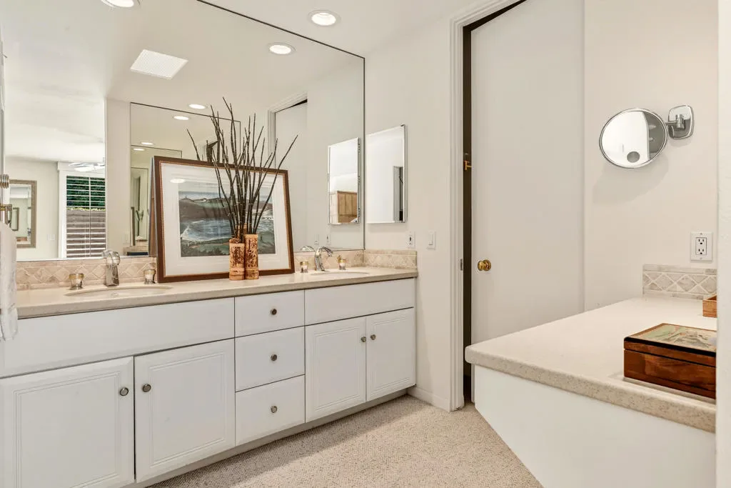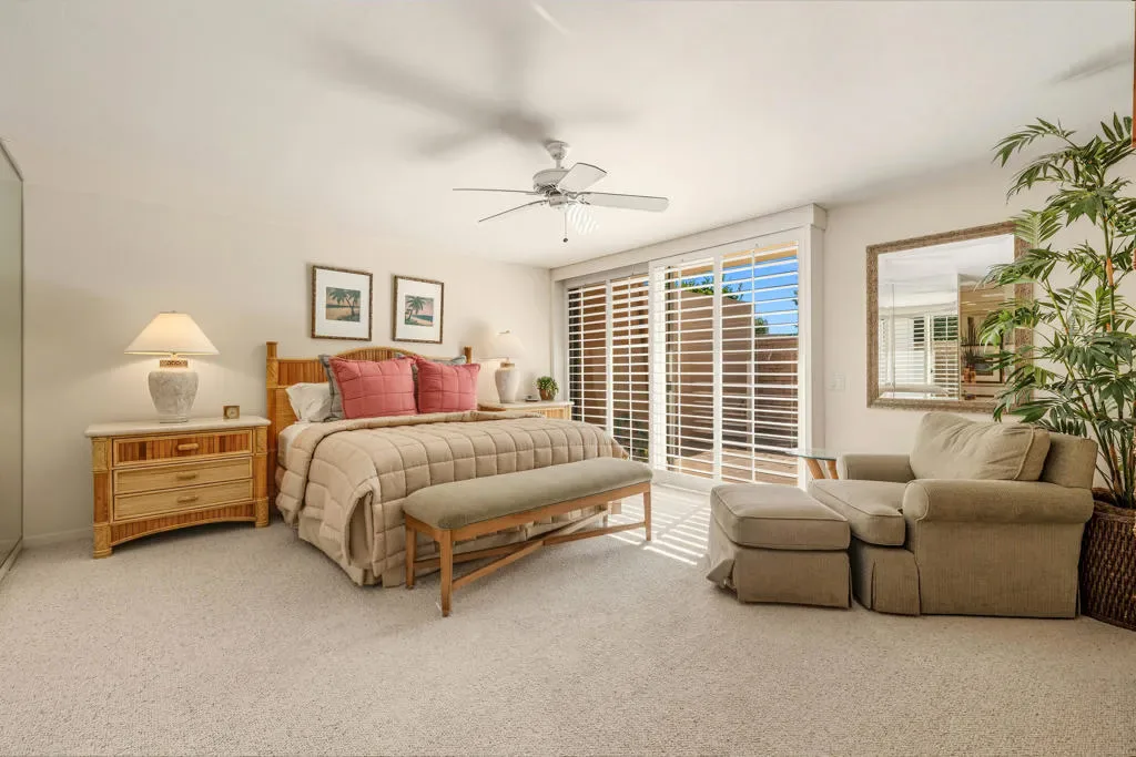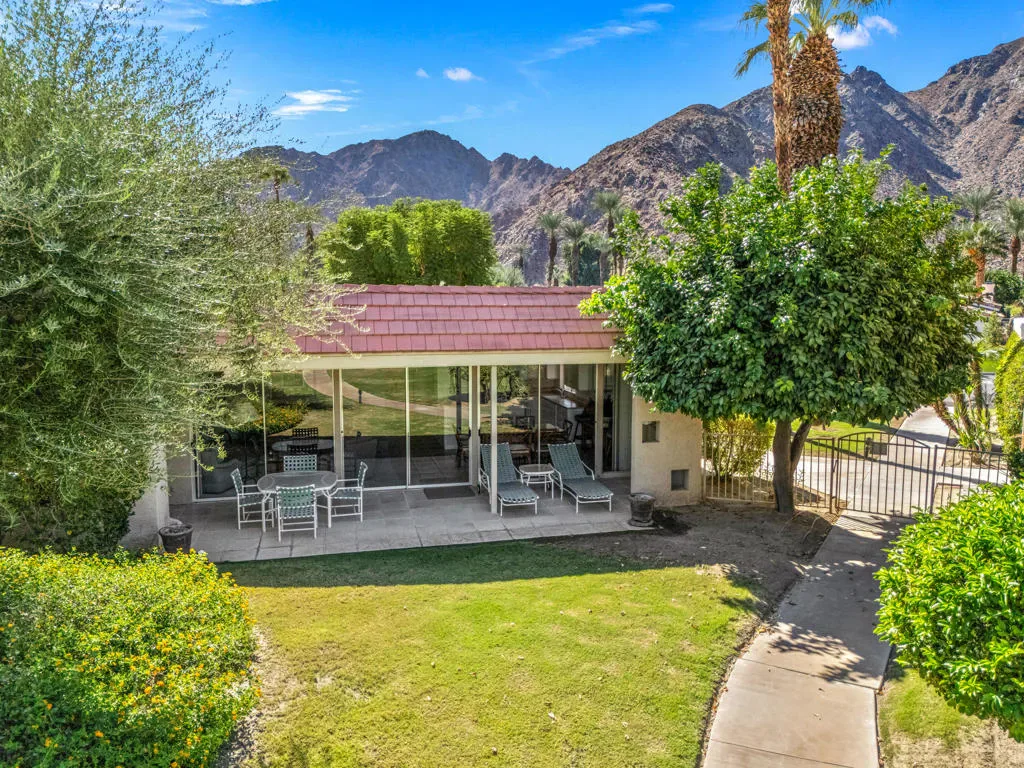 Mid-Century modern furnished Condo built in 1967 designed by legendary architect William Krisel who helped define famous Palm Springs modern architecture. This Indian Wells Country Club Sandpiper Condo has fantastic location, 2 bedrooms, 2 bath, large atrium patio, 2 car garage and 1864 Sq. Ft. of interior living with extended patio overlooking the beautiful pool and mountain views. Walk into light and bright open floor plan with high ceilings, wall of glass sliders in the spacious Great Room, high ceilings, stone fireplace, and built-in custom cabinetry galore. Formal Dining area with views. Kitchen has picturesque south mountain views, light countertops, white appliances, informal wet bar, and seating. Light tile floors throughout; carpets in the bedrooms. Primary Bedroom with walk-out private atrium and mountain views. Primary Bath has light countertops, dual sinks, big walk-in closet, large vanity, and separate toilet area with tub/shower. Guest Bedroom has walk- in closet, and ensuite bath with white tiled shower. Large Laundry Room for extra storage. Enjoy the privacy of Indian Wells Country Club!