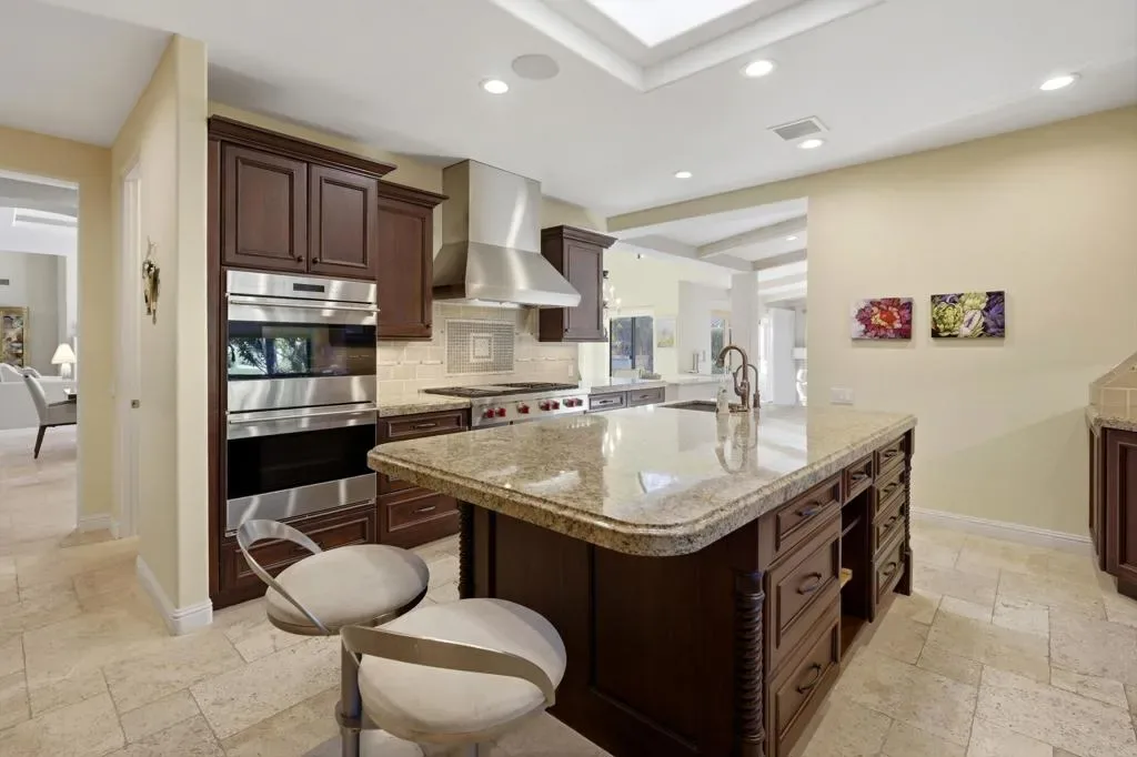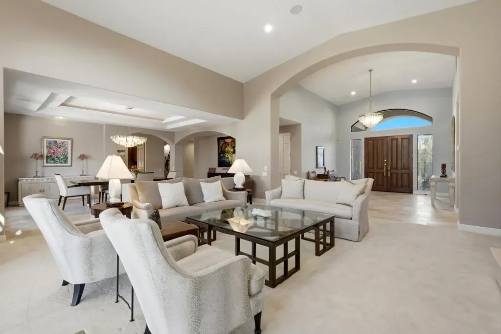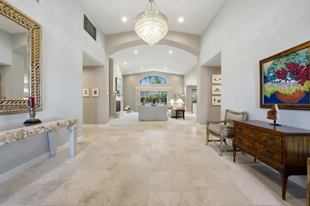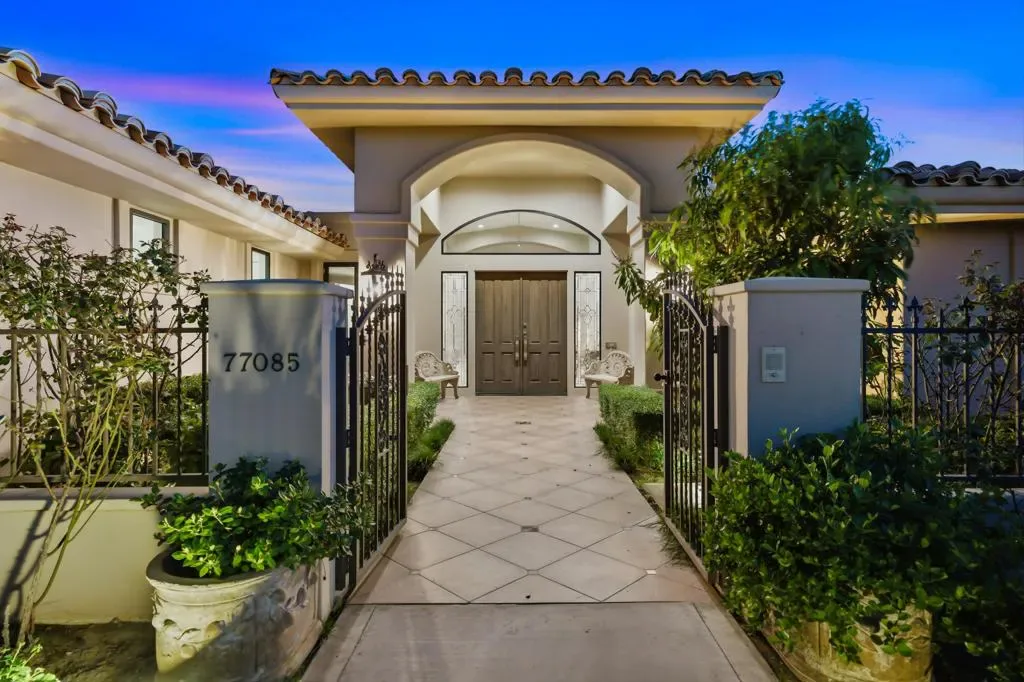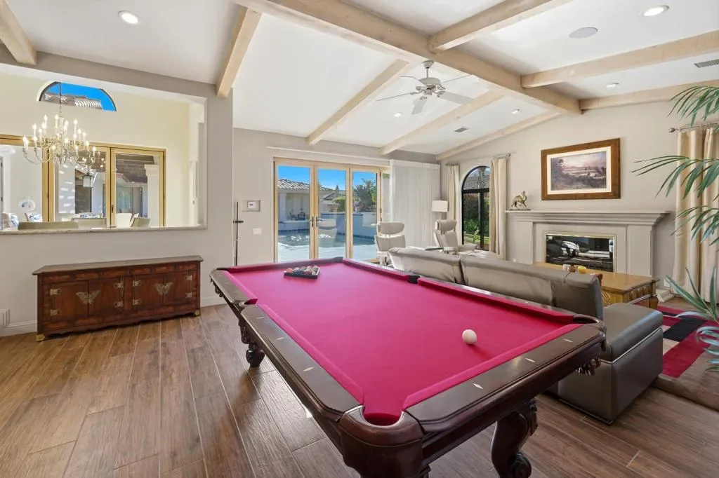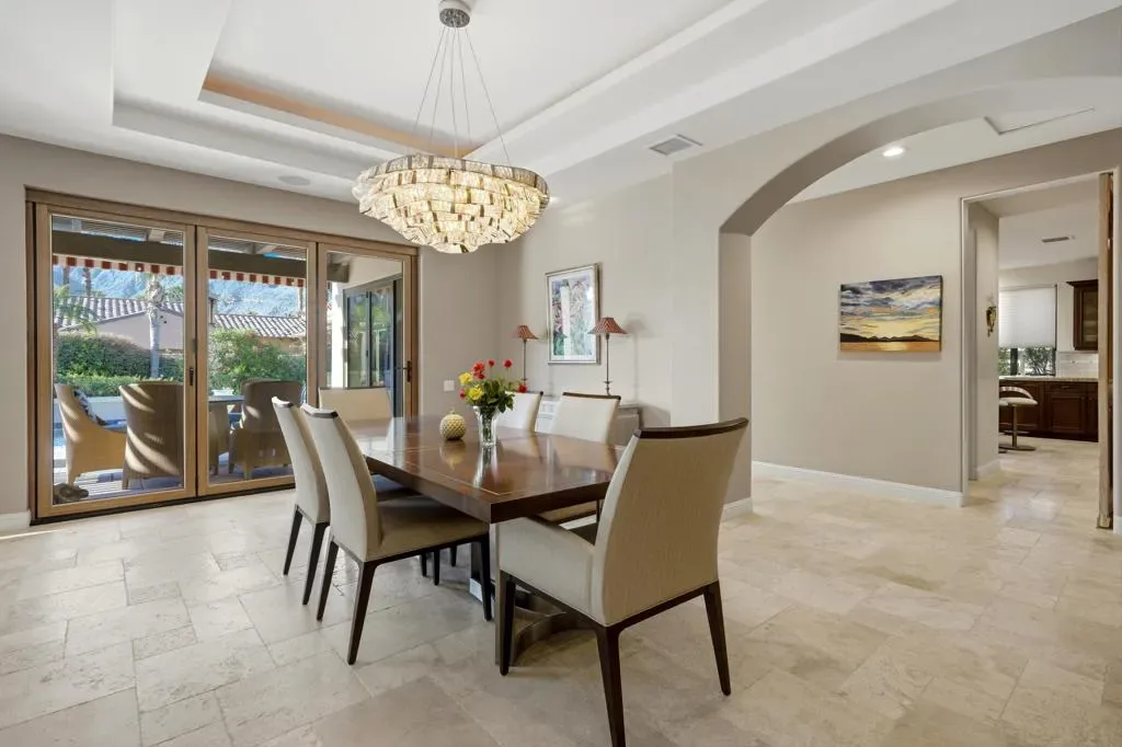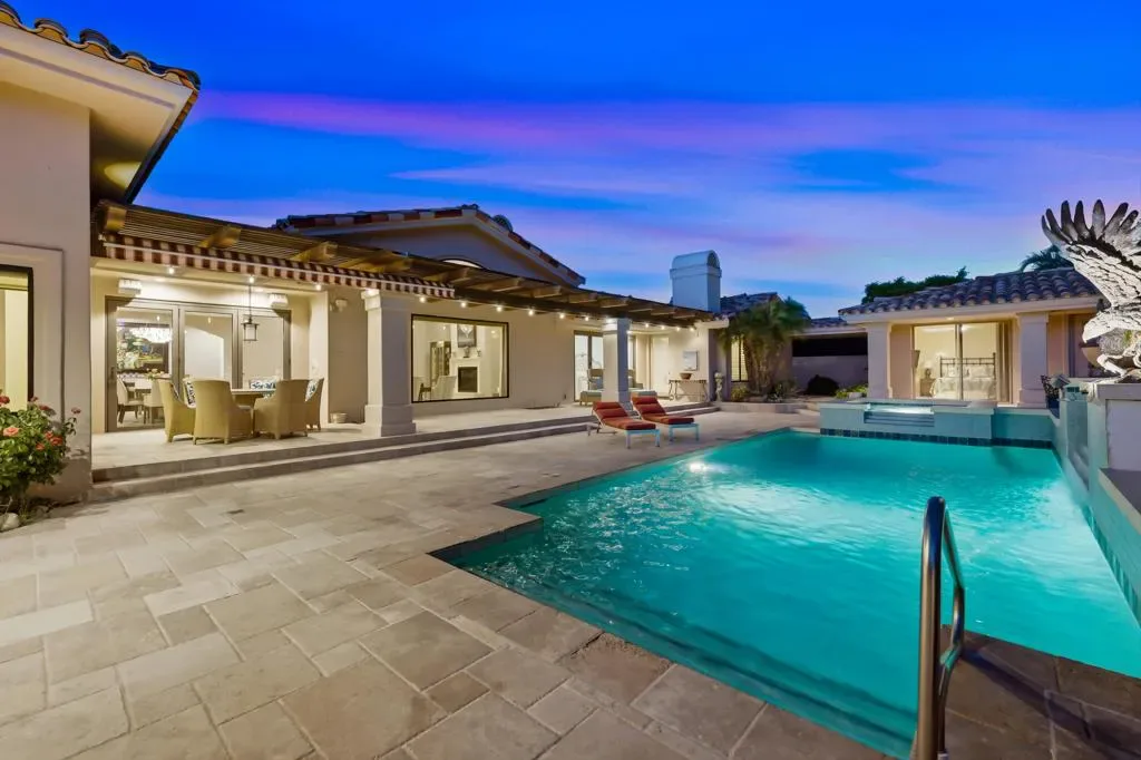 Located behind the gates of Indian Wells Country Club, this beautifully positioned residence captures the essence of desert living, with sweeping Santa Rosa Mountain views and a seamless indoor-outdoor experience. With 5 ensuite bedrooms, 6 1/2 baths, 4 fireplaces and on 1/2 Acre this is perfect if you are looking for a newer home since a much of the home was rebuilt in 2017. A grand entry with crystal chandelier opens to a wall of glass framing the pool, waterfall, and mountains, creating a natural connection between interior and exterior spaces.High volume ceilings and abundant natural light define the interiors, while thoughtfully designed walls, arches, and display niches throughout provide an exceptional backdrop for art. The formal living room with its large window expanses and fireplace offer a striking yet inviting setting, while the formal dining room with soffit lighting and fold away Nano doors s ideal for entertaining.The gourmet kitchen is appointed with Wolf appliances, 2 dishwashers, 2 refrigs, central island w/sink, warming drawer,walk-in pantry, built-in desk, soft close cabinets & a comfortable eating area-designed for both everyday living and gathering. It opens to a massive family room with fireplace & wet bar, creating a relaxed, functional space for casual moments.Most areas along the south side of the home open with Nano folding doors to the outdoor living area beyond, enhancing the indoor-outdoor connection & capturing the surrounding mountain views.The spacious primary suite is privately positioned in its own wing, featuring a sitting area, fireplace, & two large walk-in closets a dressing area, freestanding tub & large shower & more. Three guest bedrooms are located on the opposite side of the home, providing separation and privacy. The 5th bedroom is a detached Casita with kitchenette, offering comfortable accommodations for guests.Outdoor living is elevated with a saltwater pool and spa with pebble finish, a cascading waterfall feature, & expansive stone-tiled patios–all set against a stunning mountain backdrop.Features include 5 skylights, 5 solar tubes, newer flooring, newer windows throughout, surround sound speakers, whole-house water filtration system, tankless on-demand hot water, 6AC, roof tile replaced in 2017. The air-conditioned garage is ideal for a car collector, complete with work area, office, and bath. Cul-de-sac with only 2 homes. A rare offering combining scale, privacy, character, & refined des