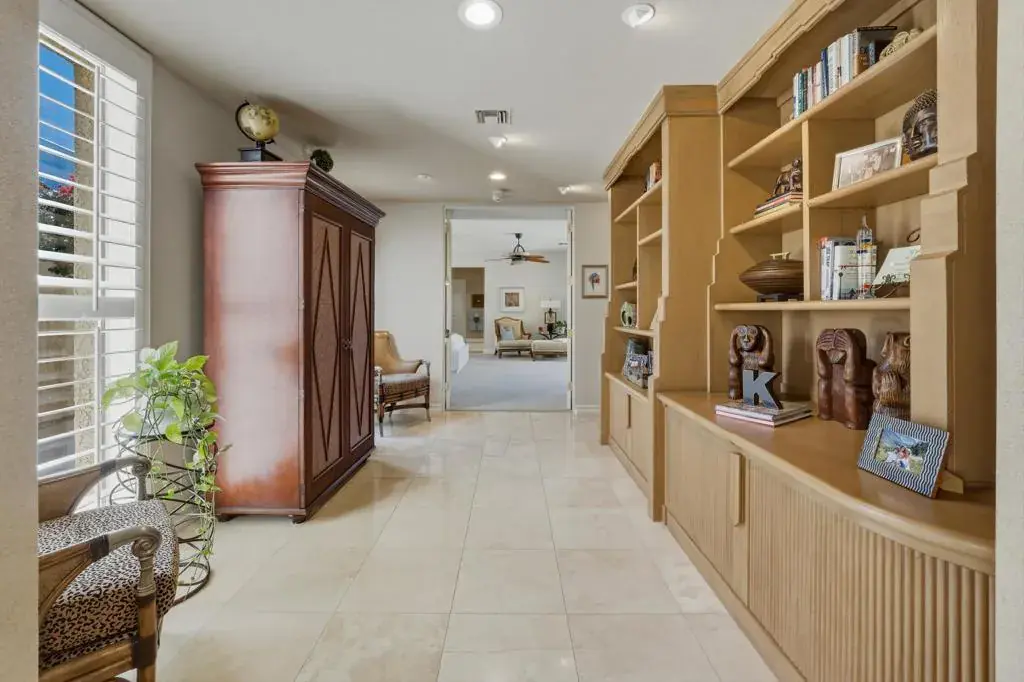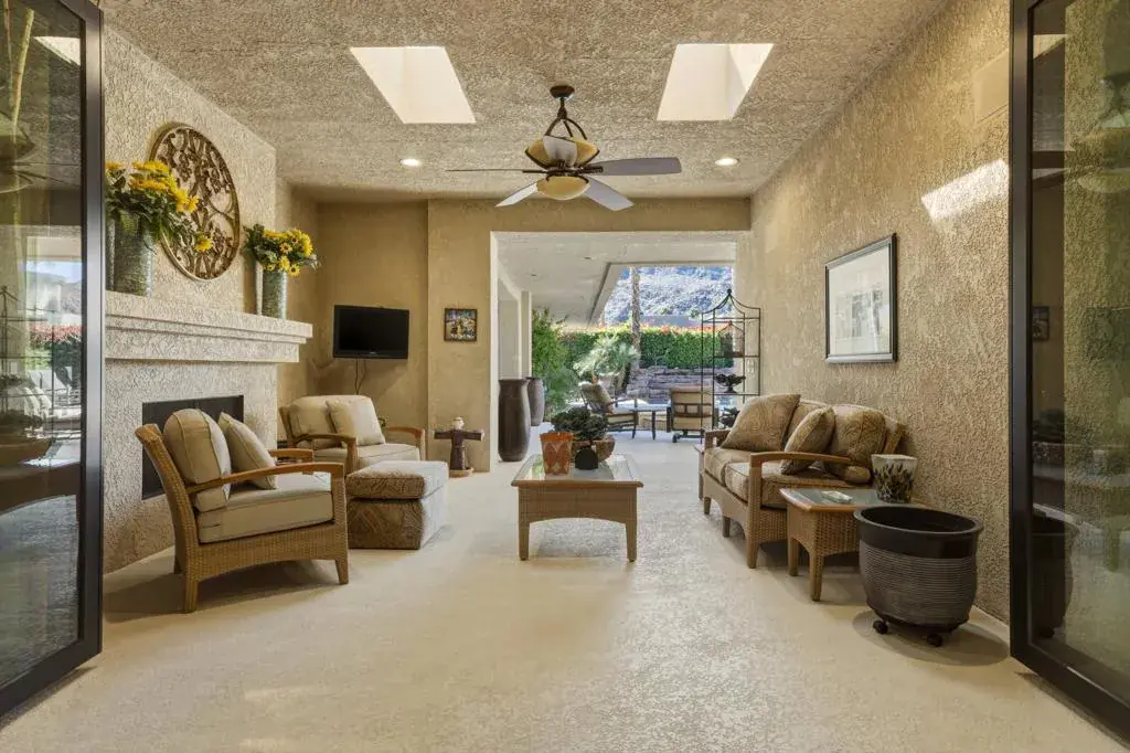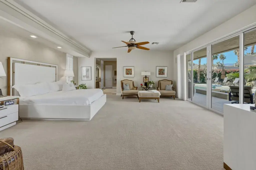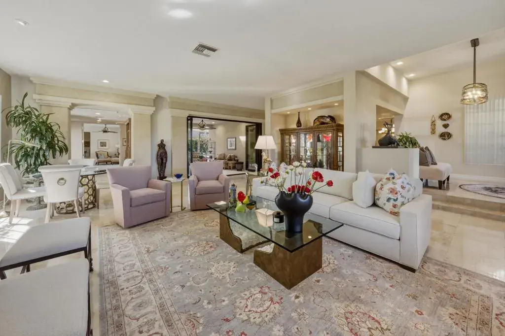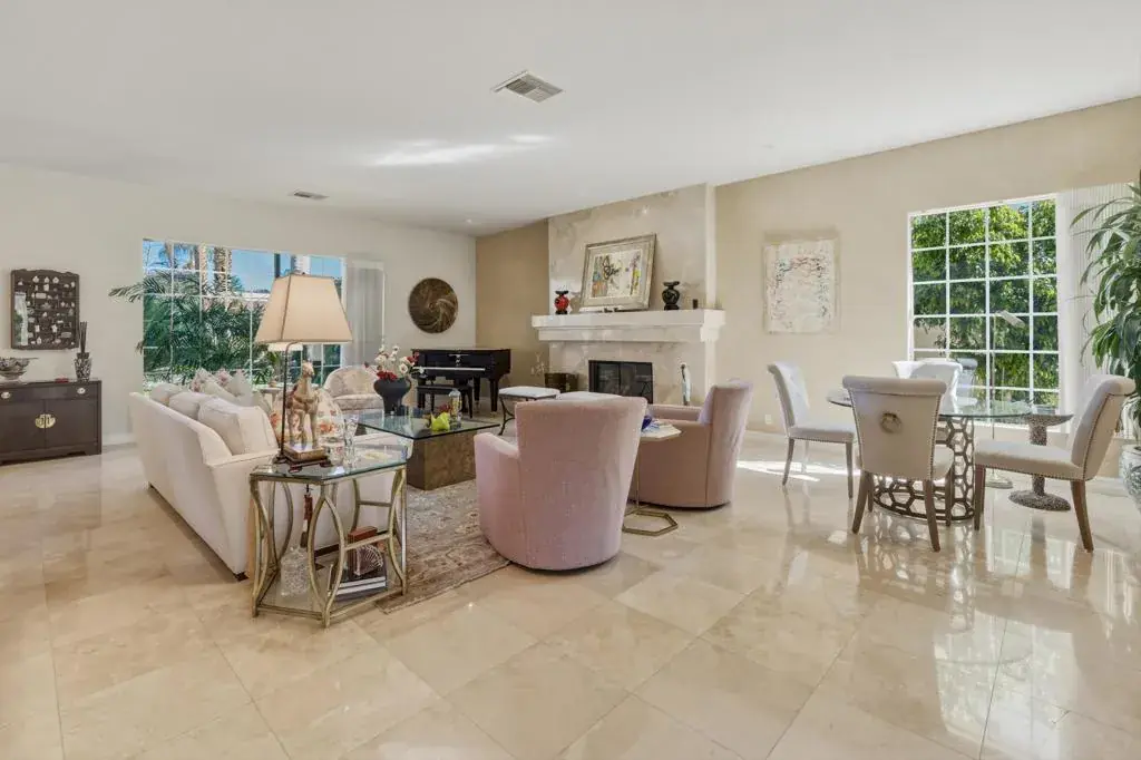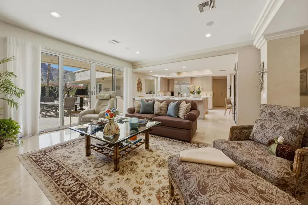 Welcome to luxury desert living behind the private gates of Indian Wells Country Club. This stunning custom estate offers breathtaking south-facing mountain views and the privacy of a 22,216 sq. ft. corner lot–your own serene desert sanctuary.Designed for both everyday comfort and upscale entertaining, the home flows effortlessly from one impressive space to the next. The intimate living room features a beautiful fireplace, soaring ceilings, and polished travertine floors, opening to a perfectly placed step-down bar, a formal dining area with a built-in buffet and a tasteful Powder Bath for your guests. The inviting family room and newly remodeled kitchen capture sweeping views of the sparkling saltwater Pebble Tec pool and mountains beyond. Complete with custom cabinetry, quartz countertops, a breakfast bar, and center island, the kitchen is ideal for casual gatherings and effortless hosting.A thoughtful split-wing floor plan creates exceptional privacy. The expansive primary suite is a true retreat with a separate sitting area, office alcove, soaking tub, walk-in shower, dual vanities, and a large walk-in closet. Across the home, three additional ensuite bedrooms offer a perfect guest setup.Step outside to a resort-style backyard oasis featuring an outdoor patio living room with fireplace, multiple dining and lounging areas, and a covered patio with built-in BBQ bar and outdoor kitchen. Lush landscaping surrounds the home, while a rock wall waterfall adds a tranquil touch to the pool setting.Additional highlights include an epoxy-floor, 3-car garage with ample storage and A/C. All of this–plus NO HOA.