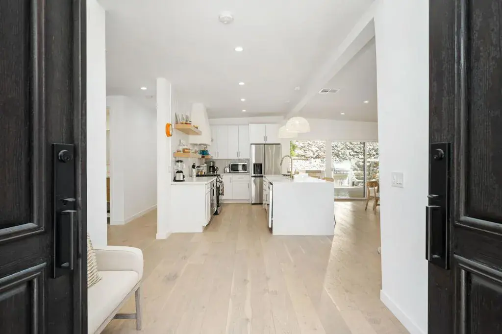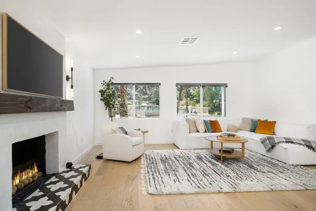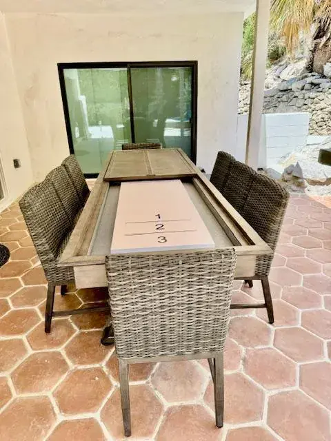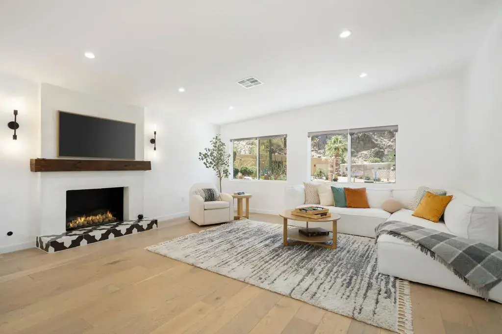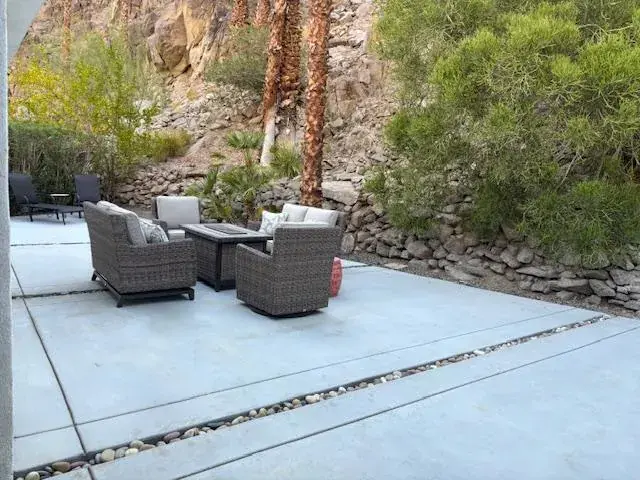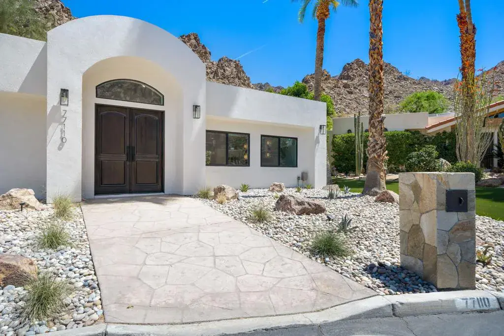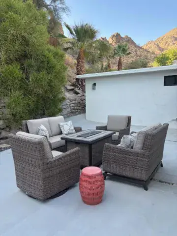 Available for Nov 2025 – May 2026. Nestled in Indian Wells Country Club, this fully renovated 3 bedroom- 2 bath Mid-Century modern home combines modern conveniences with its original charm. The interior features beautiful white oak floors, an open fully-stocked Kitchen with Quartz counters and Stainless Steel Appliances, Large Island with 4 bar stools. A light and bright Dining area for seating 6 – 8 with a wall of windows overlooking the Patio. Spacious Living Room offers a wood mantel accentuating the charming smooth finished stucco Fireplace with Flat Screen TV. The Luxurious Primary Suite has a King Bed, Flat Screen TV, Desk and the bath offering dual vanities and large walk-in shower, there is a slider out to Patio & Spa area. Spacious Guest Rooms are beautifully appointed, one with Queen-size & the other Full-size. Escape to a serene oasis with this exceptional patio retreat. As the sun sets, gather around the built in BBQ, Frig and Dinner table for an intimate evening with friends and family, accommodating up to 8 guests with the table transforming into a large shuffleboard game adding an element of fun and excitement to your gatherings. Unwind in style by the private salt-water Spa and rainfall Shower. Just steps to the community Pool. There is 1 car spot in Garage. Minutes to El Paseo for Shopping, Dining & short drive to world class Golf & the Paribas Tennis Gardens.