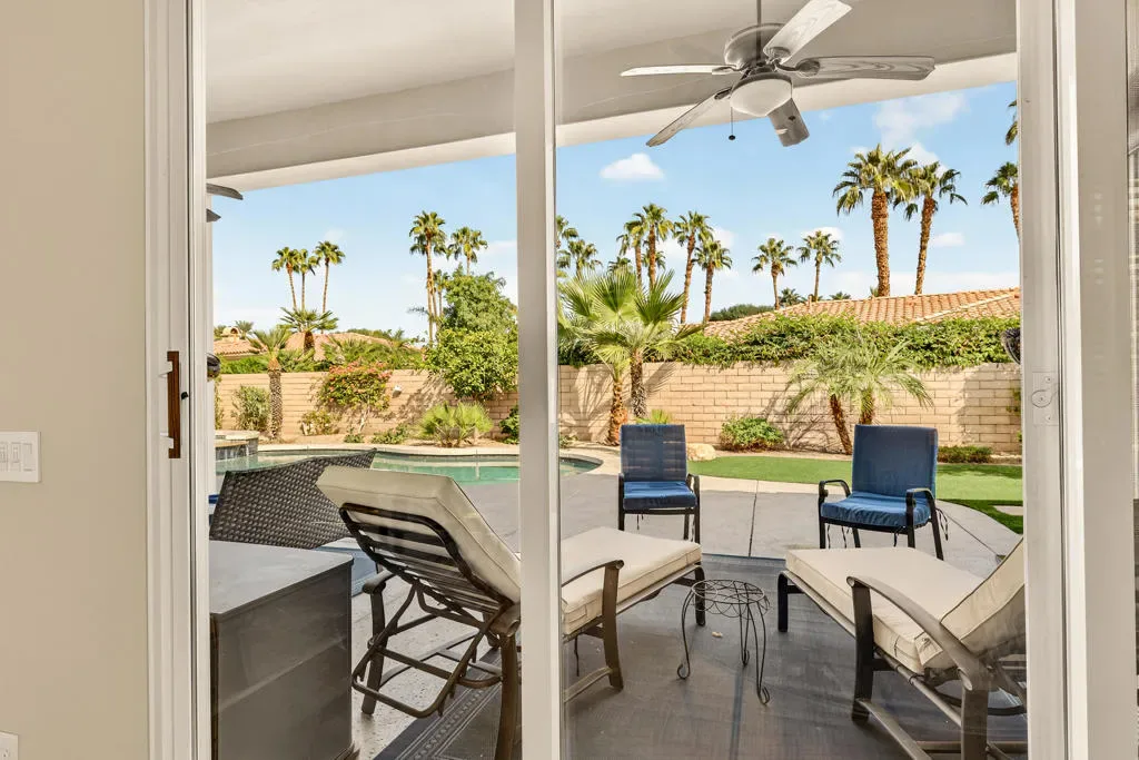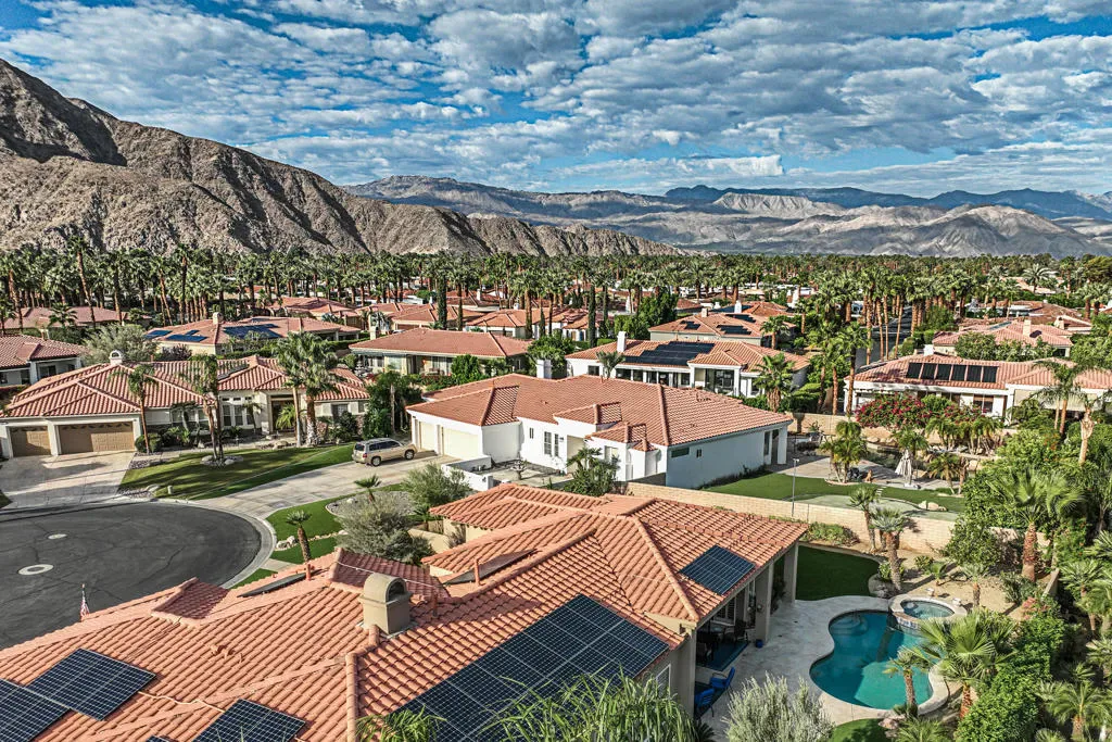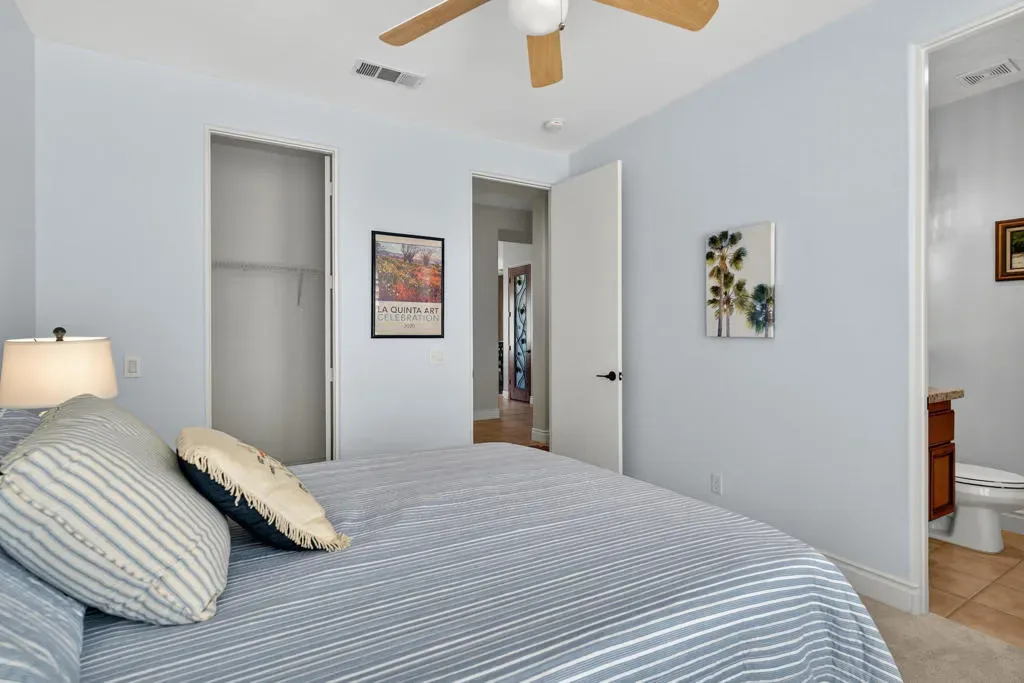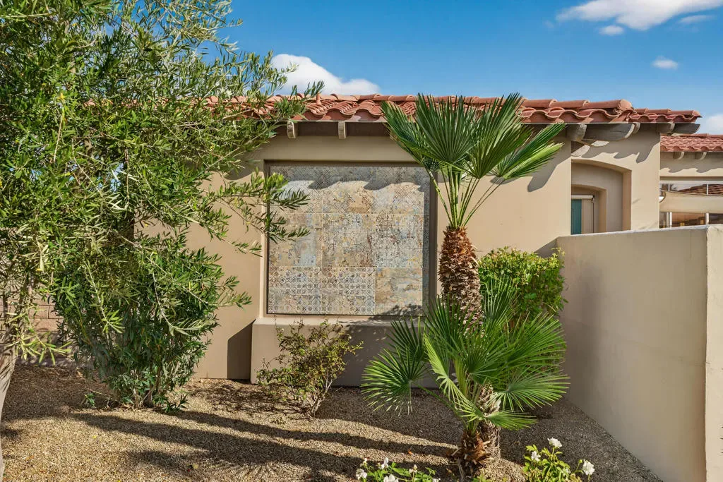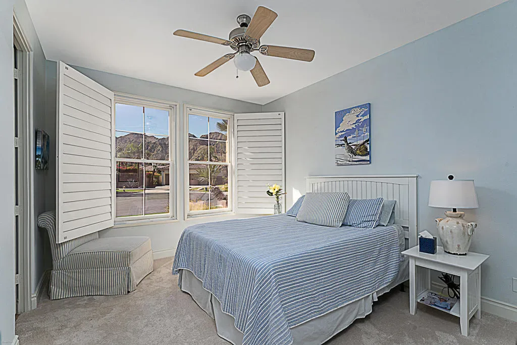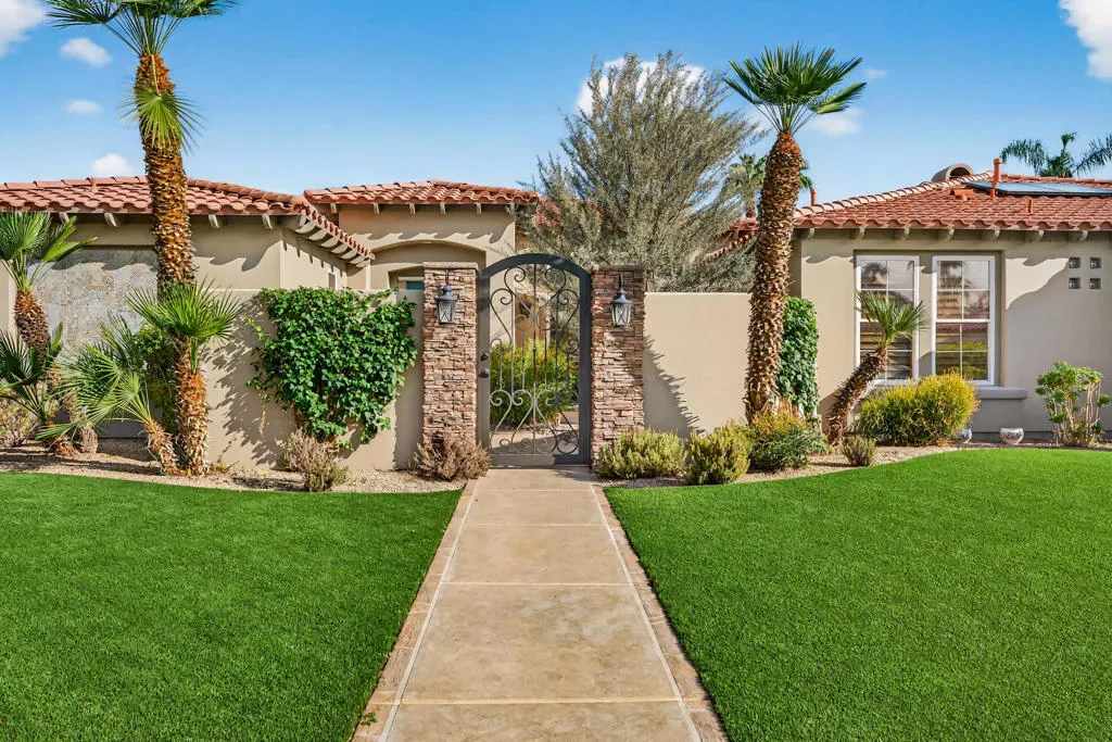Four bedrooms, all ensuite plus a powder room. 10′ & 12′ ceilings throughout. It features an ideal bedroom layout: the primary suite is on one side of the home, providing great separation from the three additional guest bedrooms on the other side, each with its own ensuite bathroom. A powder room is available for guests. All in nearly 3,000 square feet, many exterior updates, interior in A+ condition also with various updates, definitively in move-in condition. Views? YES, great southern mountain views from many positions both inside and out, starting with the charming courtyard at the entry, to the back where property sits higher than those on the pool side so there are expansive vistas and real privacy with Mt. San Jacinto as a backdrop. Sits at the top of a cul-de-sac in one of the few enclaves inside IWCC that has real live children and people under 60 (no offense to my compadres with whom I share this demographic). The yard space is great for kids and dogs and even those a bit older will find it relaxing, perfect for entertaining and most importantly, naps. Landscaping is especially low maintenance, all grass is turf, bushes and trees require infrequent trimming.Come see it, you will be glad that you did, time well spent.